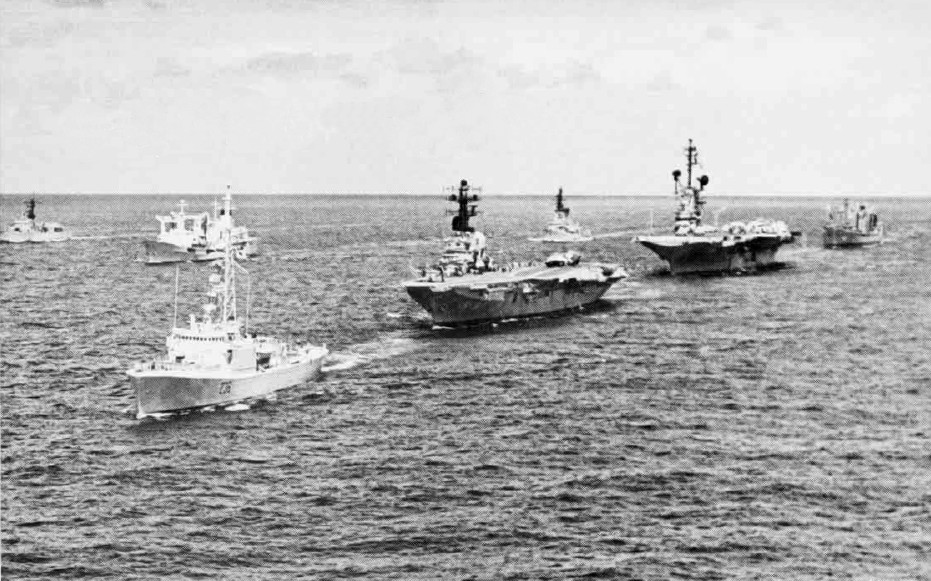 173k | Canadian, Australian, and U.S. Navy ships underway near Hawaii during the RIMPAC '72 exercise. Identifiable ships are the escort destroyer HMCS Gatineau (DDE236), followed by the aircraft carriers HMAS Melbourne (R21) and USS Ticonderoga (CVS-14). In the distance, as seen beyond Gatineau's mast, is HMCS Provider (AOR508), identifiable by her goal post, single funnel and RCN paint scheme. USN photo. U.S. Navy Naval Aviation News, December 1972 issue, p. 26. |
