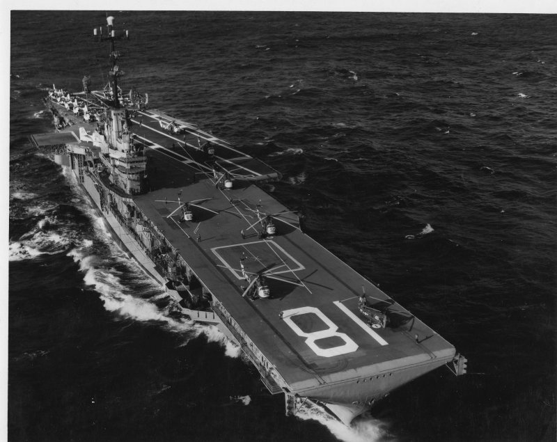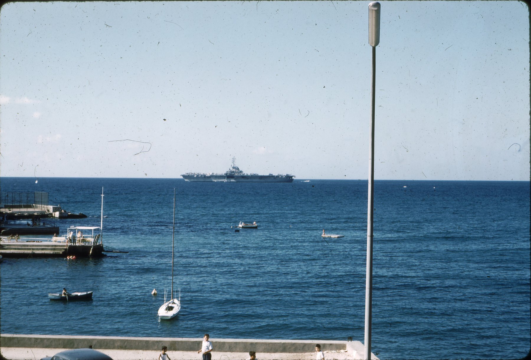 340k | USS Wasp (CVS-18) off Beirut, Lebanon, August–September 1958. "On 15 July, the carrier put to sea to patrol waters off Lebanon. Her Marine helicopter transport squadron left the ship five days later to set up camp at the Beirut International Airport. They flew reconnaissance missions and transported the sick and injured from Marine battalions in the hills to the evacuation hospital at the airport. She continued to support forces ashore in Lebanon until 17 September 1958 when she departed Beirut Harbor, bound for home." (Quoted from DANFS.) Photo by Ron Schafer, who was serving aboard USS Fort Snelling (LSD-30) at the time. |