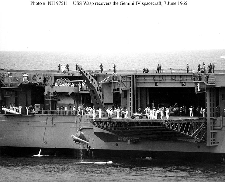 89k | Gemini IV Space Flight, June 1965 The Gemini IV space capsule is lifted aboard USS Wasp (CVS-18) on 7 June 1965, after completing a 62 revolution flight around the Earth in 97 hours and 56 minutes. The spacecraft, crewed by Astronauts James A. McDivitt and Edward H. White, landed about 48 miles short of its target and some 400 miles east of Cape Kennedy, Florida, at 12:12 PM Eastern Standard Time on 7 June. The National Aeronautics and Space Administration Gemini IV mission covered over 1,600,000 miles in the longest multimanned space flight yet flown. Caption information comes from the original NASA caption. Official National Aeronautics and Space Administration Photograph, from the collections of the Naval Historical Center (# NH 97511). |