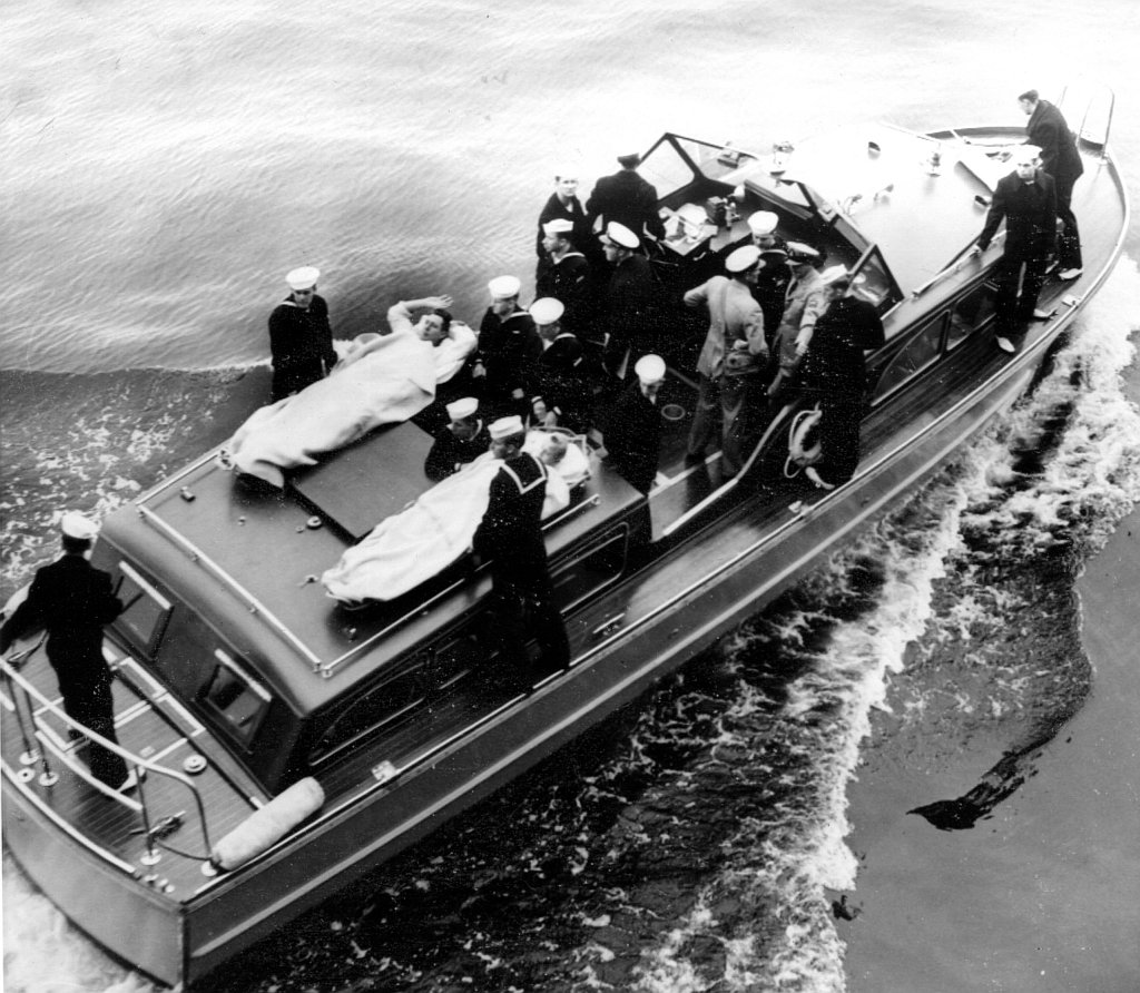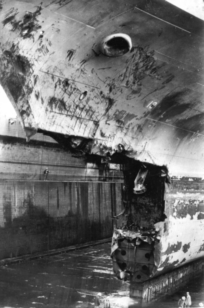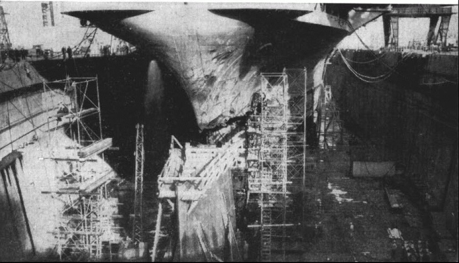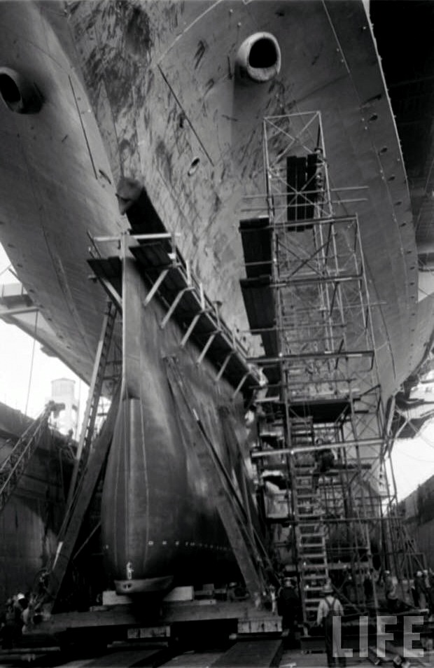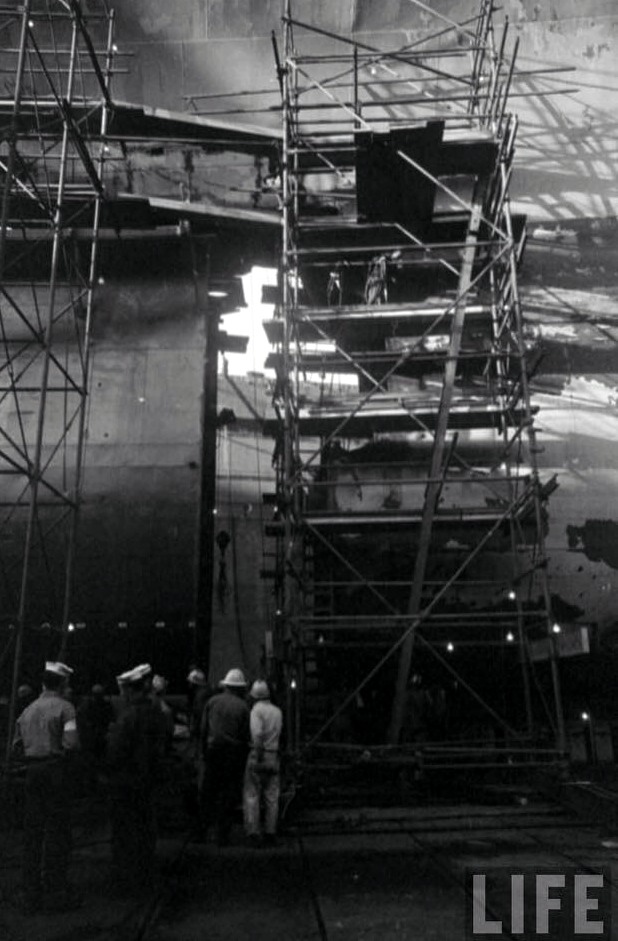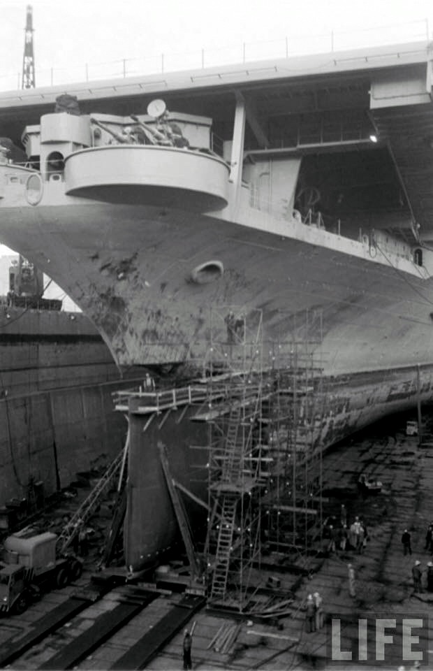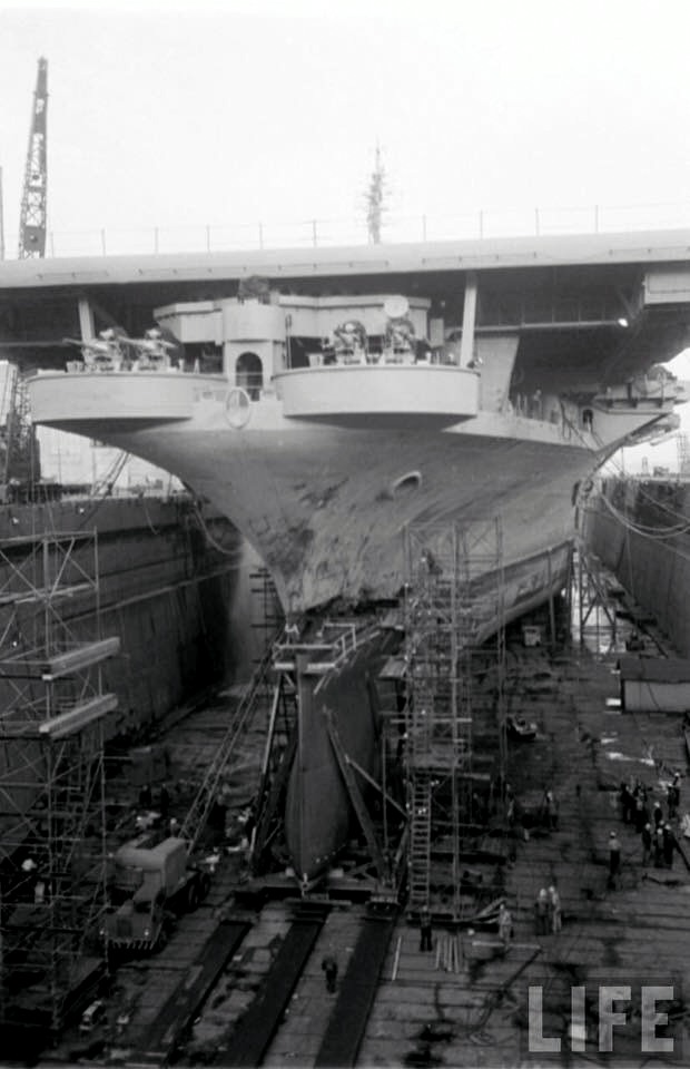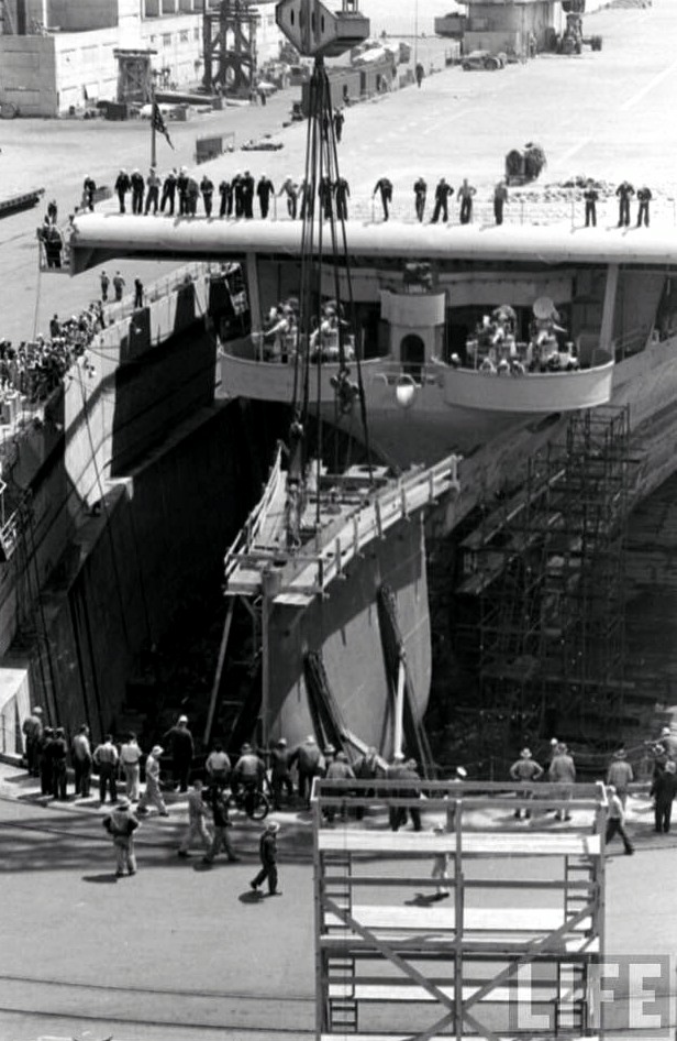 78k | On April 26, 1952 Wasp collided with destroyer minesweeper Hobson (DMS-26) while conducting night flight operations in the Atlantic, en route to Gibraltar. Hobson was cut in two and sank. Rapid rescue operations saved 61 men, but Hobson lost 176 of her crew, including her skipper. Although Wasp sustained no personnel casualties her hull was severely damaged, with a 30 x 50-foot bite gouged out of the bow. With the carrier urgently needed for duty in the Mediterranean, preparations for repairs were begun immediately. Wasp carefully proceeded to Bayonne, N.J., entered drydock there on 8 May and her damaged bow was cleared out with blow torches. The following day, the bow of aircraft carrier Hornet (CV-12) —then undergoing conversion in Brooklyn, N.Y.— was cut off and floated by barge across the bay. It was fitted into position under Wasp that afternoon, with steel plates to close any remaining gaps, and workers began round-the-clock welding operations. This remarkable repair task, which including replacing 61 lifeboats and refitting the carrier's anchor chain, was completed in only 10 days, enabling the carrier to get underway on 21 May. Shifting south to Norfolk, the crew spent a short three days preparing for deployment and Wasp sailed east across the Atlantic on 24 May. (NS021896) Wasp entering New York Harbor on 6 May 1952 after her collision with Hobson on 26 April 1952. Photo from the files of the Vallejo Naval & Historical Museum (# CVA 18 130X2-5-52). (NS021896a) Survivors of Hobson being transported aboard a Navy launch on 6 May 1952. Left to right on stretcher are CSC Gene St. Martin and RMSN David D. Sanford. Photo from the files of the Vallejo Naval & Historical Museum (# CVA 18 130X4-5-52). (NS021896b) Survivors of Hobson on the flight deck of Wasp on 6 May 1952. Photo from the files of the Vallejo Naval & Historical Museum (# CVA 18 130X6-5-52). (NS021696c) Being assisted and maneuvered by tugs, USS Wasp (CV-18) approaches the dry dock at Bayonne, New Jersey, in May 1952 for bow replacement and repair. LIFE Magazine Archives, Ralph Morse photographer, shared by Peter DeForest. (NS021696d) Yard workman at Bayonne, New Jersey, with flag, used to properly center and line up USS Wasp (CV-18) in the dry dock. LIFE Magazine Archives, Ralph Morse photographer, shared by Peter DeForest. (NS021696e) Initial inspection of the damaged bow of USS Wasp (CV-18), before emptying the dry dock so repairs can begin. LIFE Magazine Archives, Ralph Morse photographer, shared by Peter DeForest. (NS021863) Damaged section of Wasp's bow is shown as water drains from Bayonne drydock. Naval History & Heritage Command photo # NH 97512. (NS021663d) Bow view of the damage on Wasp after her collision with Hobson on 26 April 1952. LIFE Magazine Archives, Ralph Morse photographer, shared by Peter DeForest. (NS021863b) View of the damaged bow of Wasp on 9 May 1952 in dry dock in Bayonne shipyard. Photo from the files of the Vallejo Naval & Historical Museum (# CVA 18 130X6-5-52). (NS021663e) The bow of Hornet is being lowered into the dry dock for installation on Wasp. LIFE Magazine Archives, Ralph Morse photographer, shared by Peter DeForest. (NS021663f) Close up starboard side view of the new bow being fitted onto Wasp. LIFE Magazine Archives, Ralph Morse photographer, shared by Peter DeForest. (NS021863a) Cradled Hornet bow is moved into position under Wasp just before the "welding ceremony." From "All Hands" magazine, July 1952 issue. (NS021663c) The new bow section, removed from USS Hornet (under SCB-27A modernization at nearby New York Navy Yard), is being fitted into position on Wasp. Wasp was urgently needed for operations in the Mediterranean, so the preparation and work proceeded immediately. LIFE Magazine Archives, Ralph Morse photographer, shared by Peter DeForest. (NS021663g) Dock-level view of the new bow being fitted onto Wasp. LIFE Magazine Archives, Ralph Morse photographer, shared by Peter DeForest. (NS021663h) Overhead view of the new bow being fitted onto Wasp. LIFE Magazine Archives, Ralph Morse photographer, shared by Peter DeForest. (See also NS021294.) |