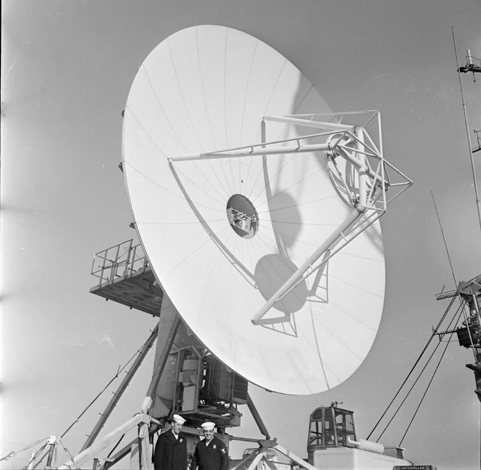79k | USS Wasp (CVS-18) in her Mercury-Gemini recovery configuration, returning to Boston in June 1966 after recovering Gemini 9A. NS021873b: Note the two space capsules painted on the side of bridge from previous missions (Gemini 4 and the combined Gemini 6A-Gemini 7 mission). NS021873d: Note the large communications "dish" on the flight deck. NS021873e: Close up of the large communications "dish" antenna installed on the flight deck. From the Boston Public Library. |