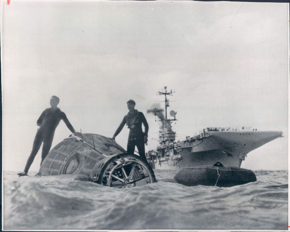 98k | USS Wasp (CVS-18) recovered Gemini 6A on 16 December 1965. The spacecraft and crew, Walter Schirra and Thomas Stafford, were brought aboard at 1132. |