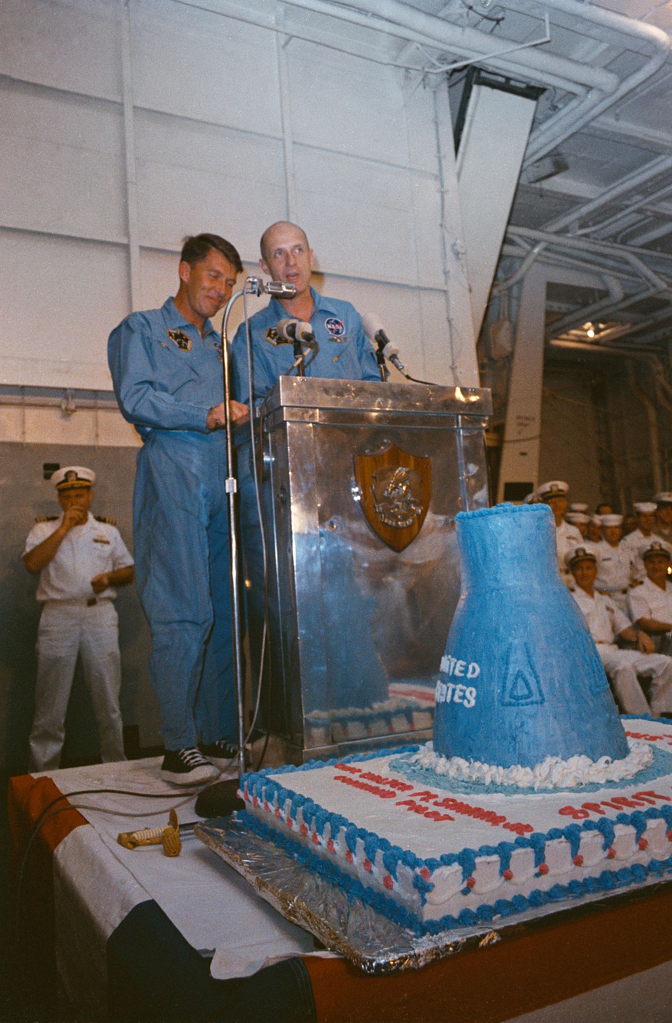 518k | Astronauts Wally Schirra (left) and Thomas Stafford talk to crew aboard USS Wasp (CVS-18). National Aeronautics and Space Administration (NASA) photo, identifier S65-61825. |