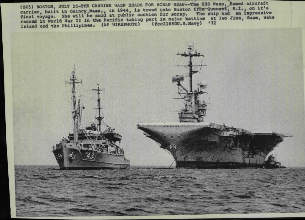 123k | "BOSTON, JULY 10[, 1972]–THE CARRIER WASP HEADS FOR SCRAP HEAP—The USS Wasp, famed aircraft carrier, built in Quincy, Mass., in 1944 is towed into Boston from Quonset, R.I., on it's [sic] final voyage. She will be sold at public auction for scrap. The ship had an impressive record in World War II in the Pacific taking part in major battles at Iwo Jima, Guam, Wake Island and the Philippines. (AP WIREPHOTO) (fcc21650U.S.Navy)" |