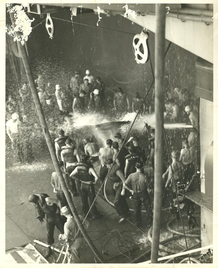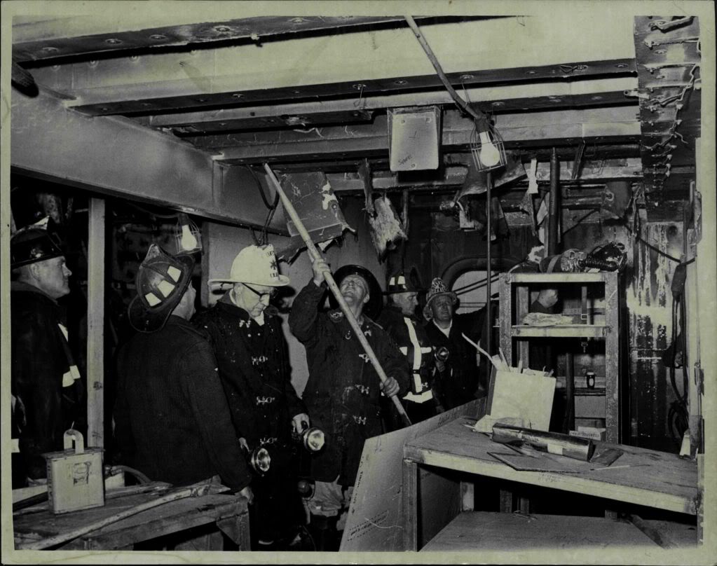 125k | "Fire aboard the Wasp in Drydock at the Navy Yard in So. Boston[, 10 September 1967]—Photo shows firefighters tearing down fibreglass insulation which smouldered in the Combat Information Center of the Carrier when welder's torch started small fire...This is only picture we could get as was not allowed in area until fire was secured...." Photo by Ray Lussier. |