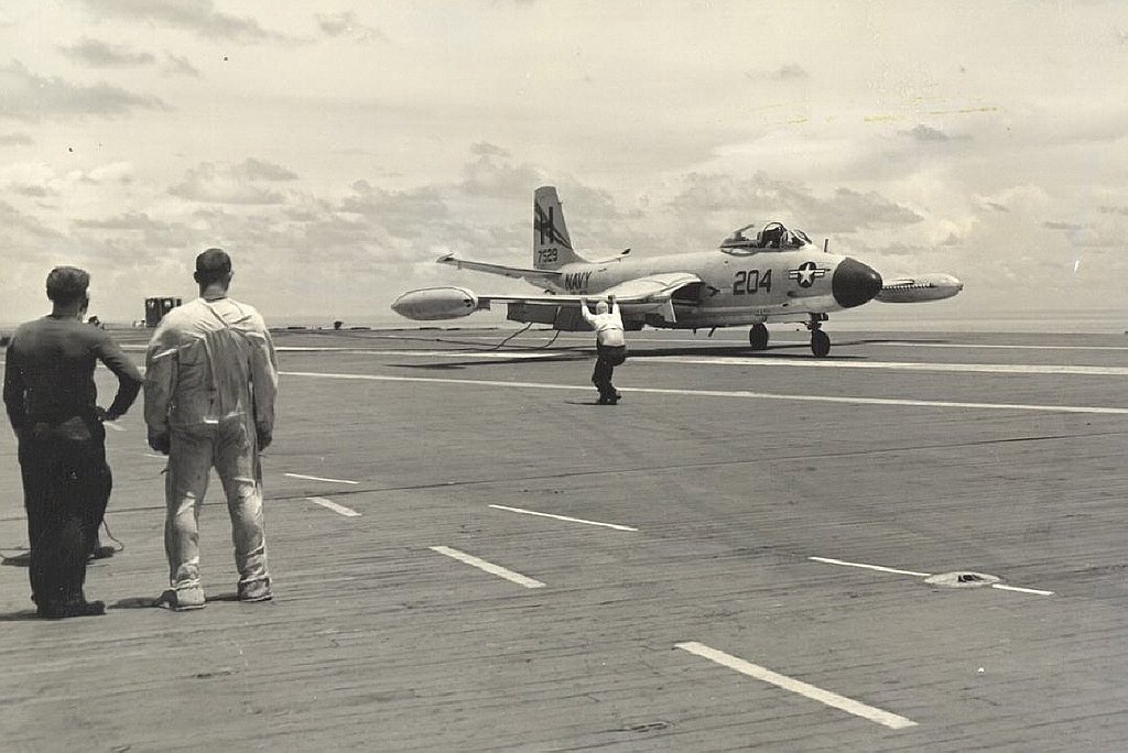 119k | A U.S. Navy McDonnell F2H-3 Banshee (BuNo 127529, modex H204) of Fighter Squadron (VF) 152 "Fighting Aces" after recovering aboard USS Wasp (CVA-18). VF-152 was assigned to Carrier Air Group (CVG) 15 aboard the aircraft carrier for a deployment to the Western Pacific, 23 April–15 October 1956. |