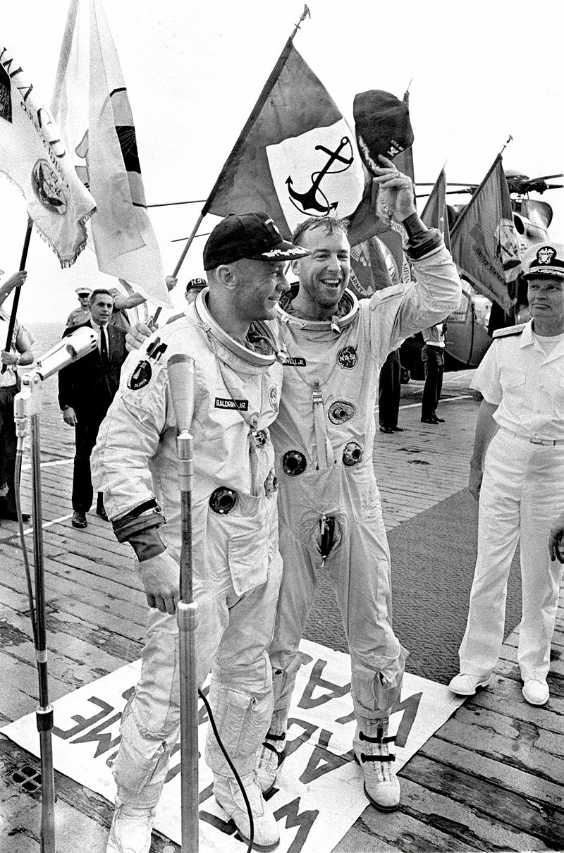 261k | Astronauts James A. Lovell and Edwin E. Aldrin Jr. are welcomed aboard the aircraft carrier USS Wasp (CVS-18) after their Gemini 12 spacecraft splashed down in the Atlantic Ocean, 15 November 1966. National Aeronautics and Space Administration (NASA) photo, # GPN-2000-001356. |