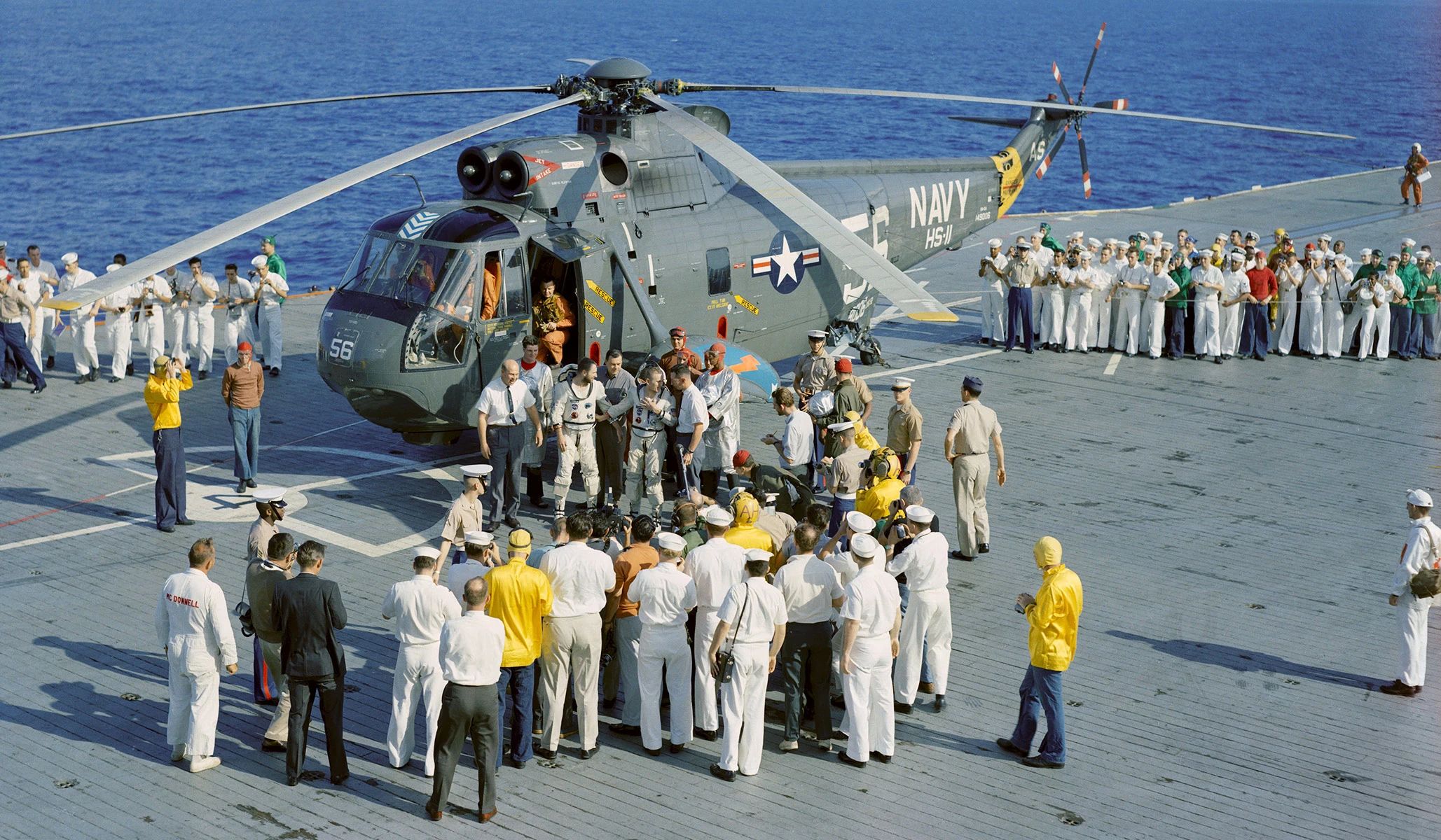 515k | Surrounded by NASA dignitaries and members of the crew of USS Wasp (CVS-18), Gemini 7 astronauts Frank Borman and Jim Lovell arrive aboard the aircraft carrier following their recovery on 18 December 1965. The astronauts were picked up from the Atlantic Ocean, following successful splashdown after two weeks in orbit, by helicopter SH-3A Sea King, BuNo 149006, modex AS56, from Helicopter Anti-Submarine Squadron (HS) 11 "Sub Seekers," part of Anti-Submarine Carrier Air Group (CVSG) 52. National Aeronautics and Space Administration (NASA) photo, identifier S65-63646. |
