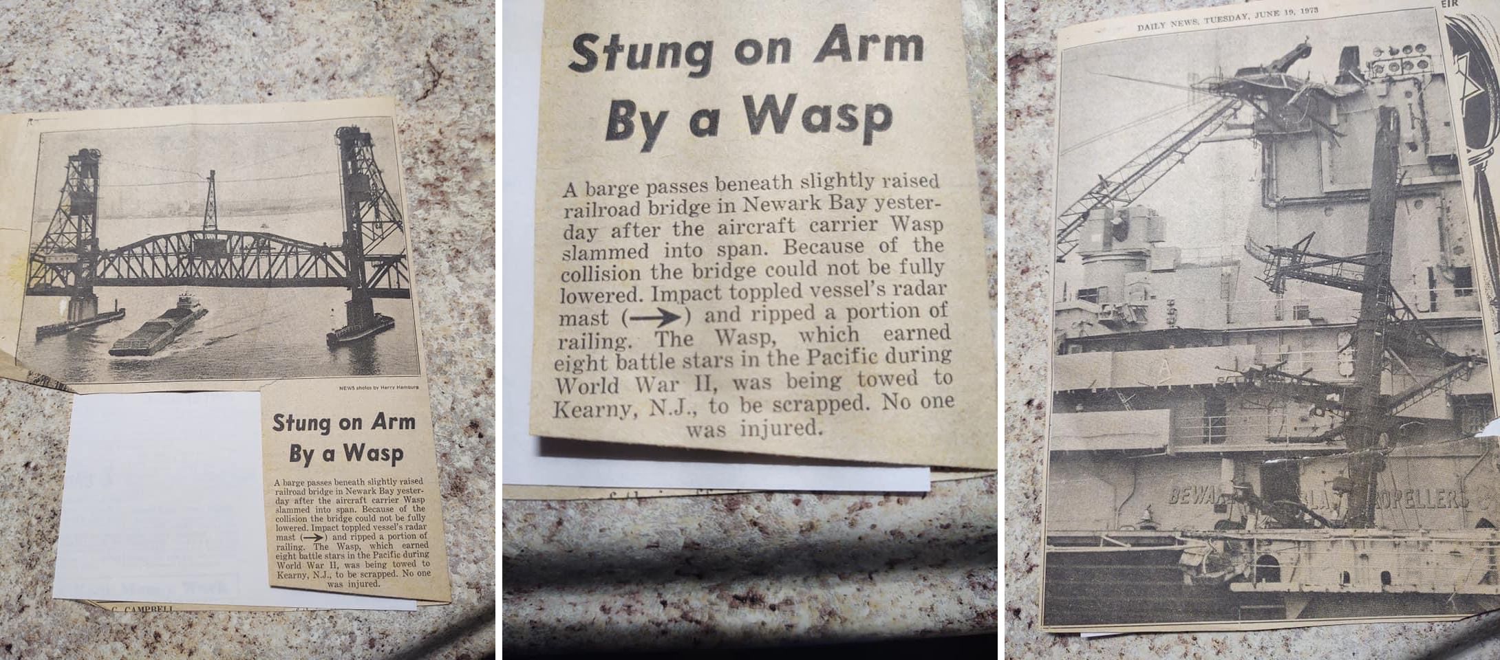 362k | "Stung on Arm By a Wasp—A barge passes beneath slightly raised railroad bridge in Newark Bay yesterday after the [former] aircraft carrier Wasp slammed into span. Because of the collision the bridge could not be fully lowered. Impact toppled vessel's radar mast and ripped a portion of railing. The Wasp, which earned eight battle stars in the Pacific during World War II, was being towed to Kearny, N.J., to be scrapped. No one was injured." Daily News, Tuesday, 19 June 1973. |