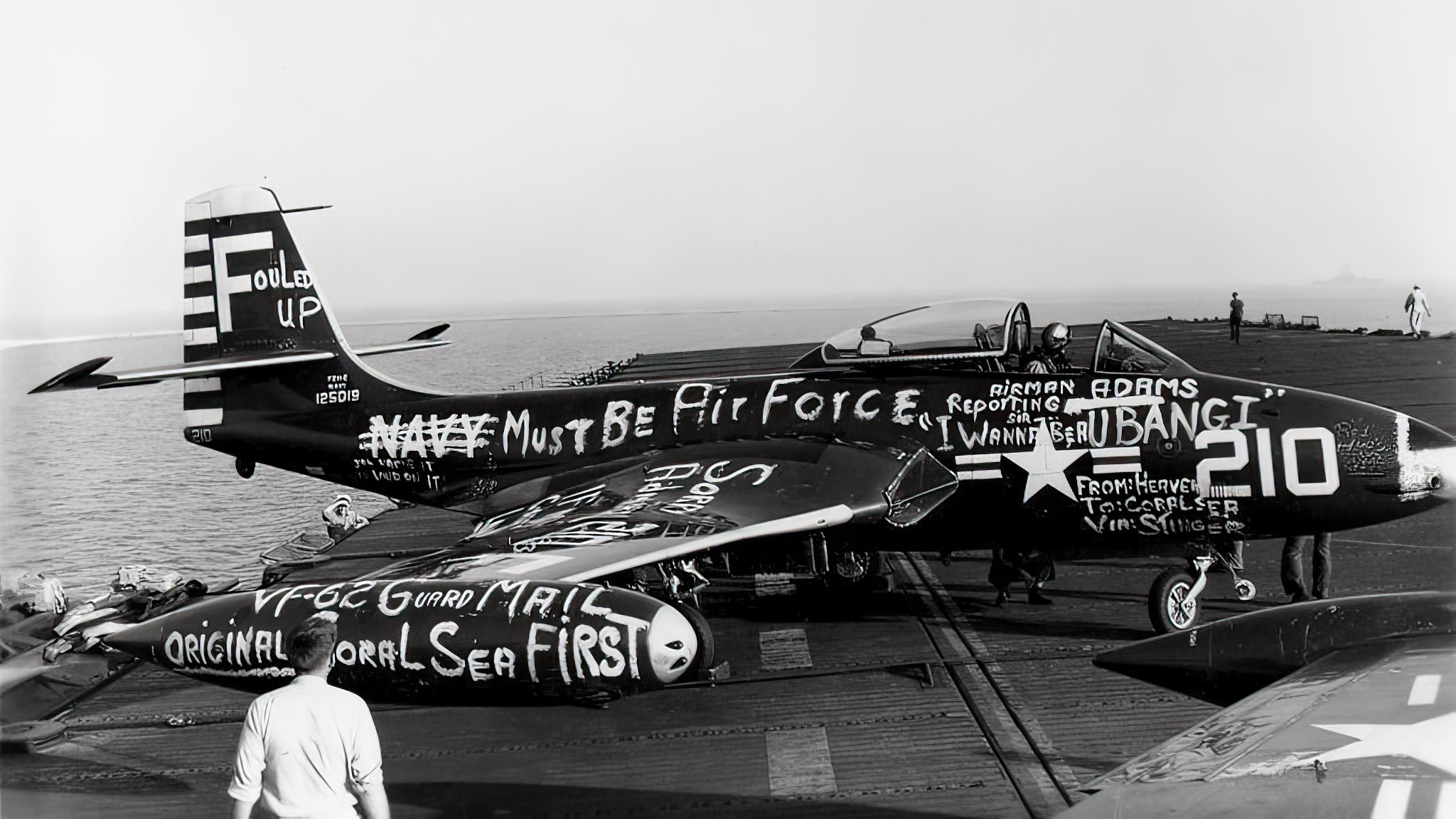 488k | This McDonnell F2H-2 Banshee (BuNo 125019, modex F-210) of Fighter Squadron (VF) 62 "Gladiators" mistakenly recovered aboard USS Wasp (CV-18), circa 1952. It was common practice during the Korean War years to paint a visiting aircraft with comments—it was all done in fun but the poor pilot had to return with his new "markings" to the ribbing of his air group. VF-62 was part of Carrier Air Group (CVG) 4 aboard USS Coral Sea (CV-43) for a deployment to the Mediterranean Sea, 19 April–12 October 1952. Wasp deployed to the North Atlantic and Mediterranean, 24 May–13 October 1952. Courtesy of the National Naval Aviation Museum. |