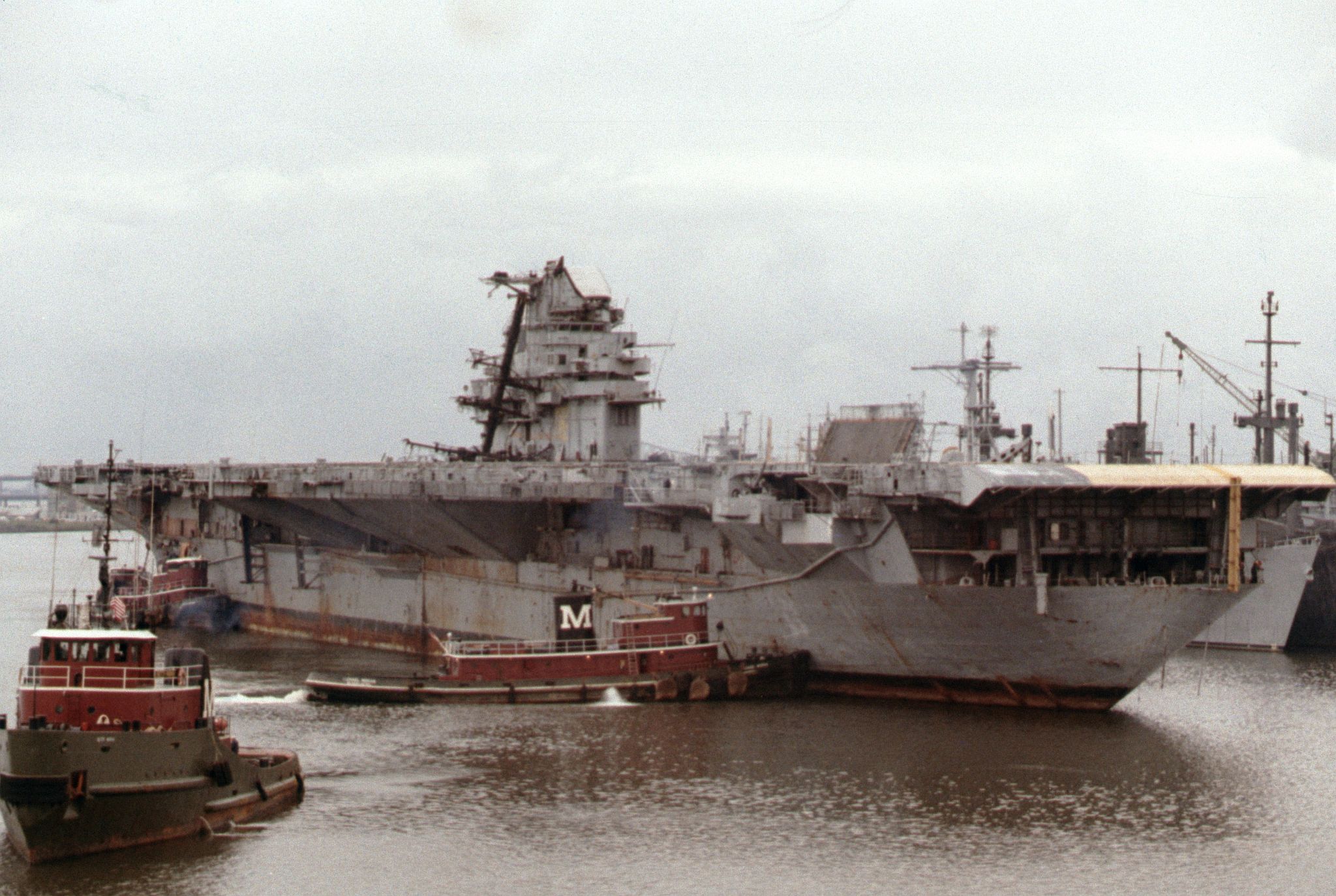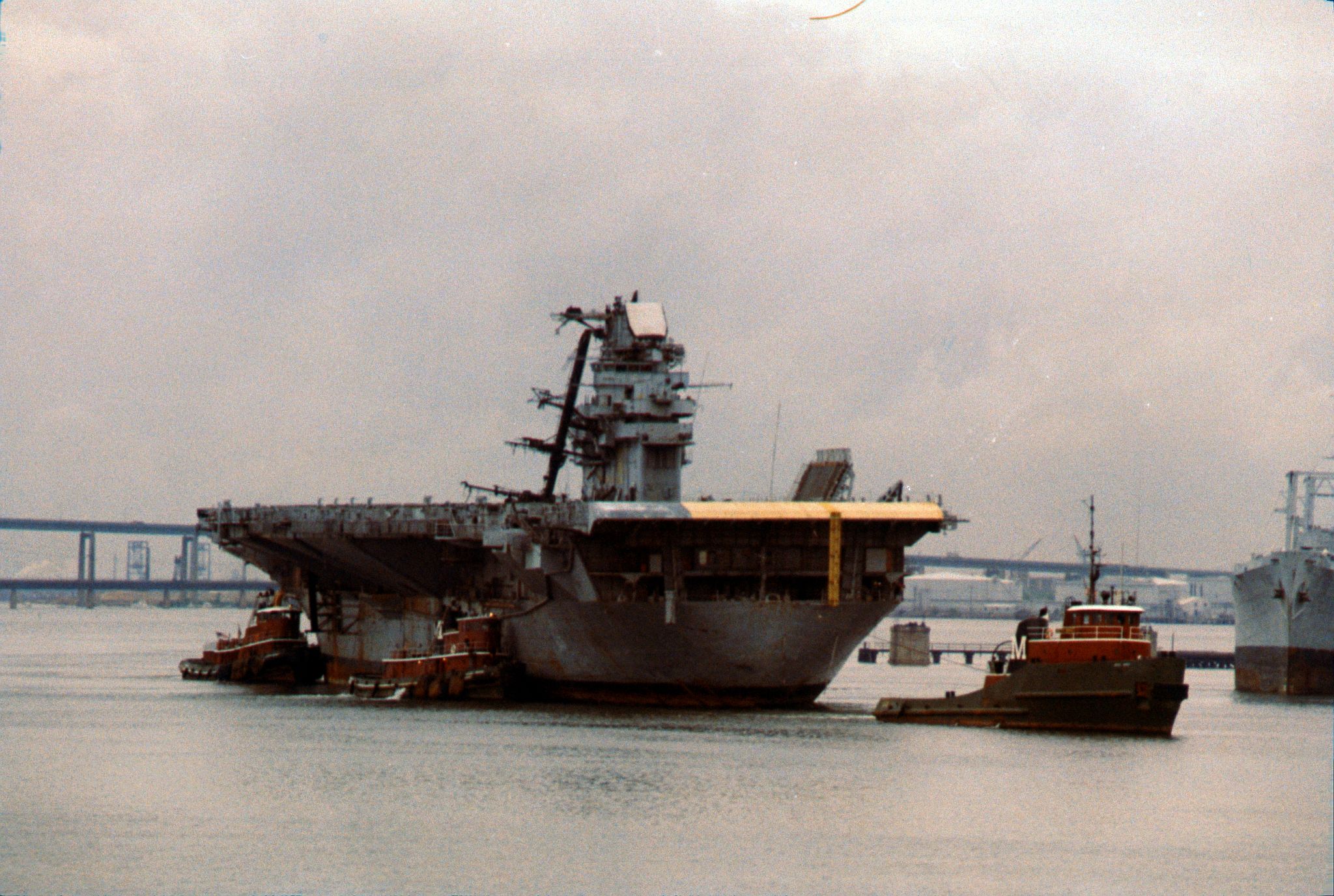 485k | Ex-USS Wasp (CVS-18) arriving at Kearny, New Jersey, for scrapping, 18 June 1973. |