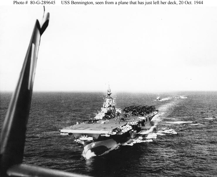 65k | USS Bennington (CV-20) photographed from a plane that has just taken off from her flight deck, during the ship's shakedown period, 20 October 1944. Official U.S. Navy Photograph, now in the collections of the National Archives (photo # 80-G-289645). |