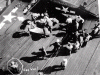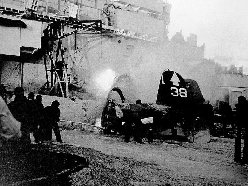 169k | VT-82 TBM-3 Avenger #101 makes a gear-up landing on 16 February 1945, after receiving battle damage during a raid over Tokyo, Japan. The plane was so badly damaged that it was pushed overboard; one of eleven lost that day. Note the empty drop tanks on the port catwalk ready for re-arming and re-fueling of the air group for the next strike. US Navy Photo, now in the custody of the US National Archives at College Park, Maryland (80-G-305176). |