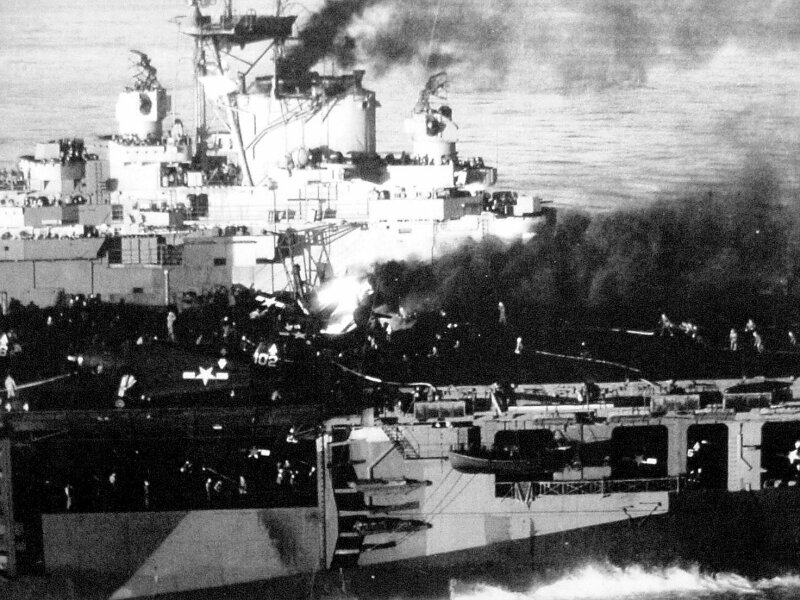 375k | USS Bennington conducting air ops and alongside for UNREP with USS Harrison (DD-573) watch standers. Task Group 58.1, February–May 1945. Photos by CTM Tom McCann. |