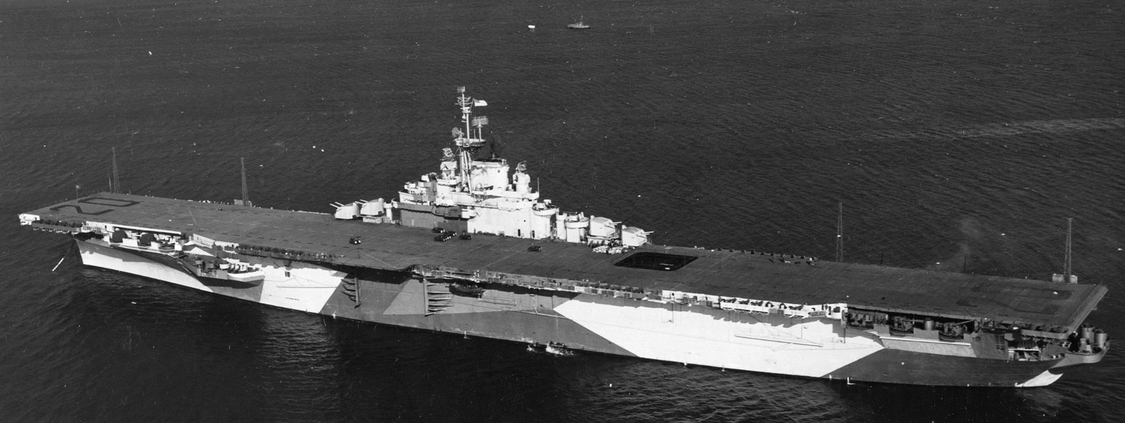 155k | USS Bennington (CV-20) underway during her shakedown, 20 October 1944, en route to Trinidad, British West Indies. She is painted in camouflage Measure 32, Design 17a (#1). Note tanker in the left distance. Official U.S. Navy Photograph, from the collections of the Naval History and Heritage Command (NH&HC), # NH 97579. |