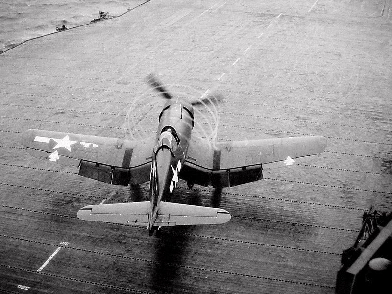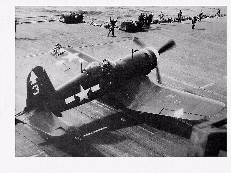 129k | TBM-3 Avenger from VT-82 deck-launching from Bennington in a rain squall, February 1945. Photo now in the collections of the US National Archives and Records Administration, #80-G-305181. |