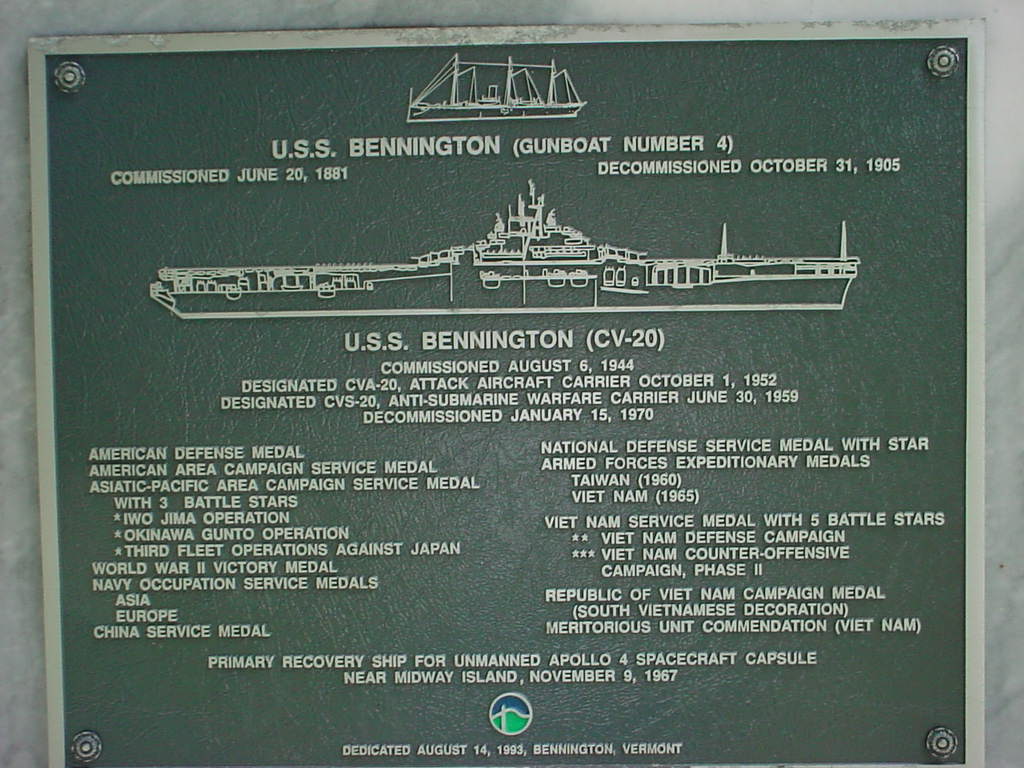 136k | CV-20 was named for a town in the southwestern corner of Vermont, the seat of government for Bennington County. During the American Revolution, Bennington was the nearest town to the site of a battle, actually fought on New York soil, 16 August 1777, in which American victory contributed to the ultimate defeat of "Gentleman Johnnie" Burgoyne at Saratoga. As the nearest town, Bennington gave its name to the battle. The battle was a major strategic success for the American cause and is considered the turning point of the Revolutionary War. A gunboat had previously borne the name. NS022028a: Map courtesy of HamsterMap.com. NS022028b: Battle of Bennington, a National Guard Heritage Painting by Don Troiani, courtesy the National Guard Bureau. NS022028: Bennington Battle Monument. Courtesy of Joseph Pires, USS Bennington Association & Web Site Historian. |