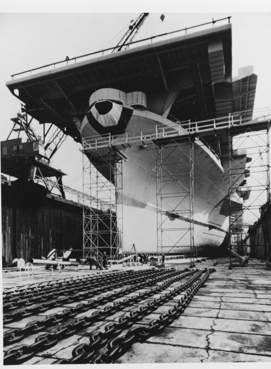 231k | The future USS Bennington (CV-20) being prepared for launching in a building dock at the New York Navy Yard, 23 February 1944. She was christened three days later. Courtesy of Mr. James Russell, Philadelphia, Pennsylvania, 1972. Naval History & Heritage Command (NH&HC) photo, # NH 75631. |