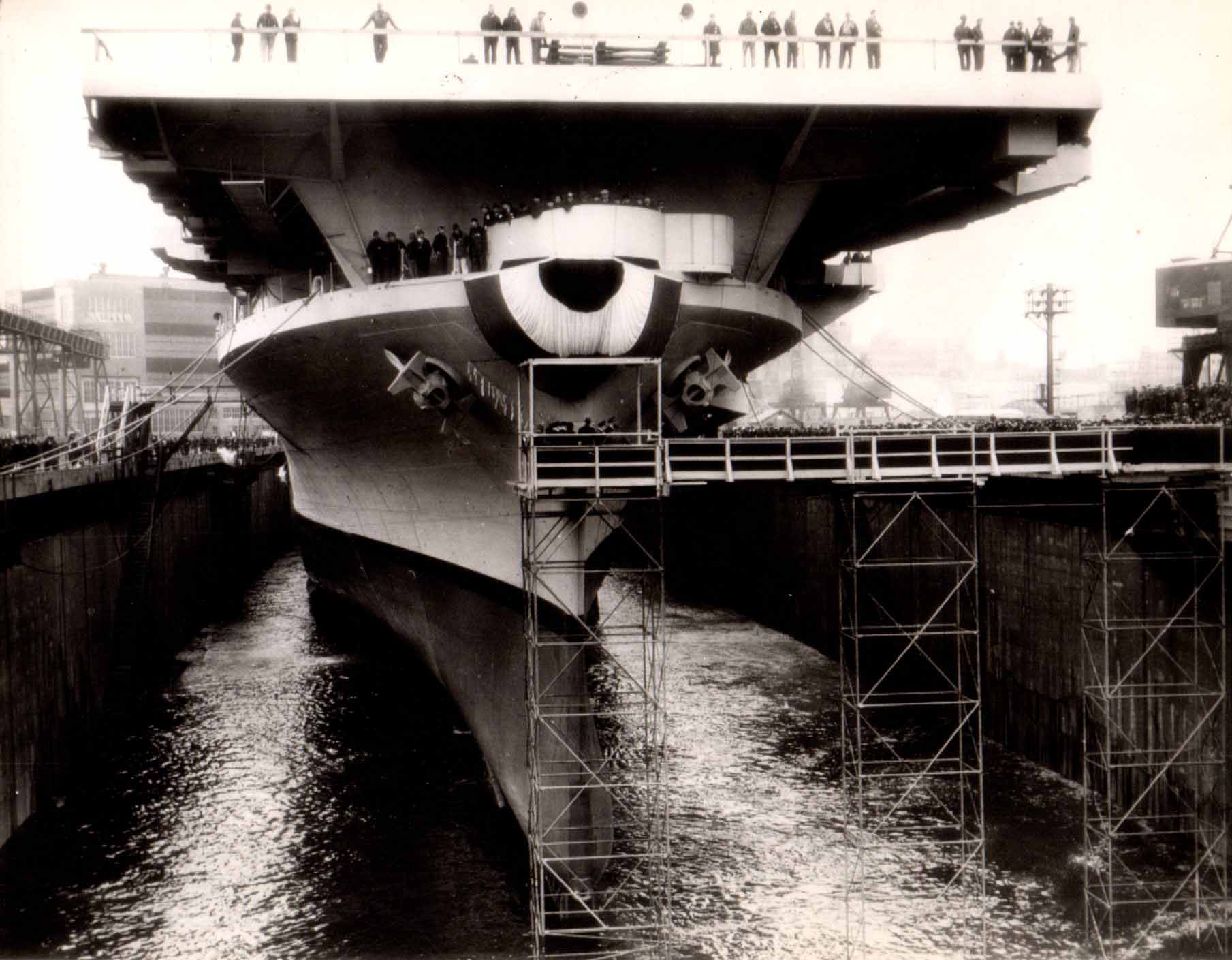 175k | The future USS Bennington (CV-20) being floated out of drydock at the New York Navy Yard, Saturday, 26 February 1944, following her christening by Mrs. Melvin J. Maas (née Katherine Endress), wife of Melvin Joseph Maas, US Representative from Minnesota (R) and Colonel, USMCR. Bennington was the first of the Essex-class carriers to be built in the New York Navy Yard and it was also the first carrier to be built in a dry-dock. |
