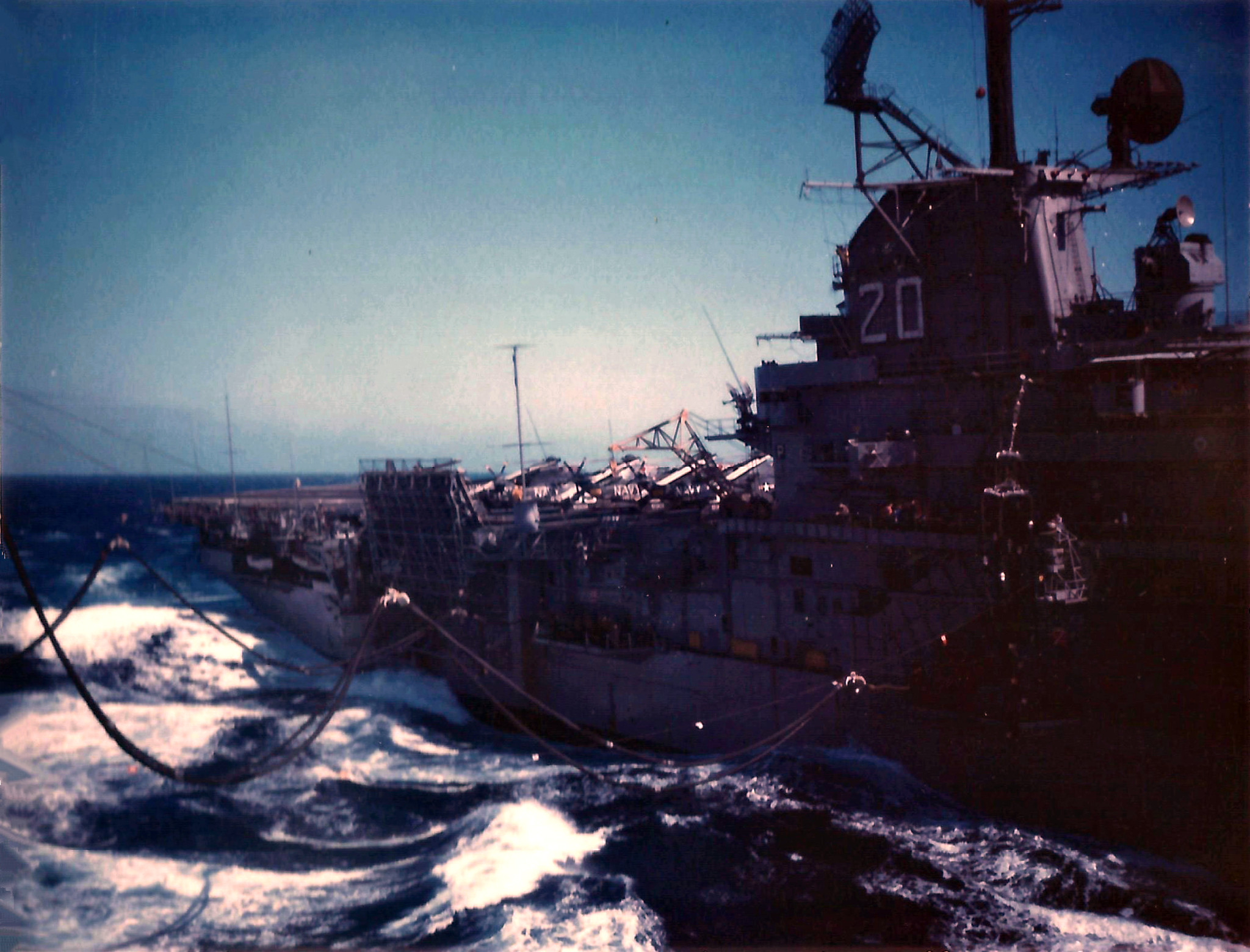284k | USS Mauna Kea (AE-22) highlines ammunition to the aircraft carrier USS Bennington (CVS-20) in the Gulf of Tonkin, 10 September 1968. Bennington, with assigned Anti-Submarine Carrier Air Group (CVSG) 59, was deployed to the Western Pacific and Vietnam from 30 April to 9 November 1968. US Navy photo # USN 1137061 by PH1 Garrison, U.S. Navy. |