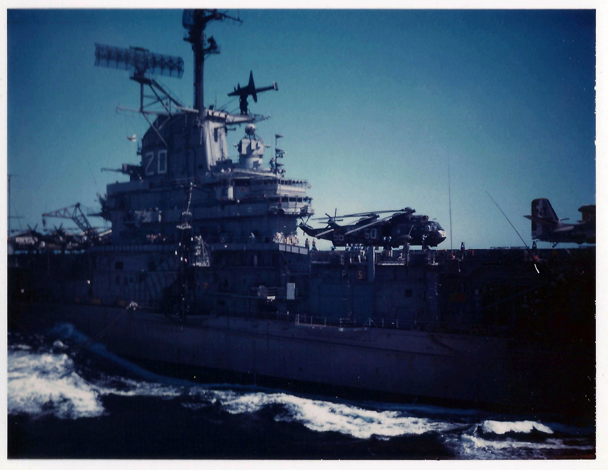 1.31M | Sikorsky SH-3A Sea Kings, Helicopter Antisubmarine Squadron (HS) 8 "Eightballers," Antisubmarine Carrier Air Group (CVSG) 59, USS Bennington (CVS-20), Yokosuka, Japan, 26–27 October 1968. NT56 was BuNo 149900, NT55 was 148995. Both were later upgraded to SH-3H standard. In the movie The Final Countdown, 148995 is the helicopter that "blows up" and leaves "Commander Owens" (James Farentino) stranded on the island. The carrier in the background is probably USS Hornet (CVS-12). |