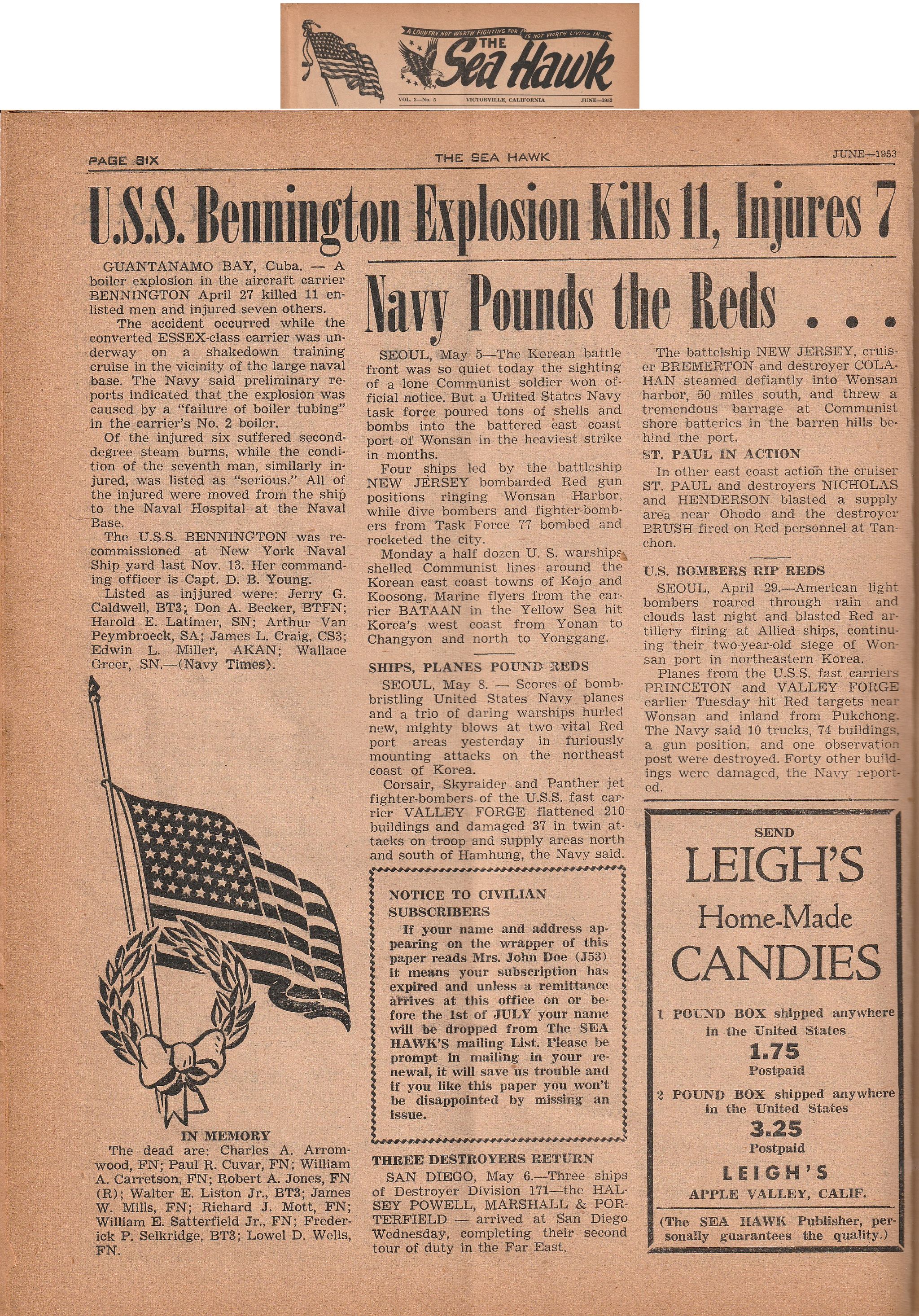 | USS Bennington (CV-20/CVA-20/CVS-20), her History and her Crew |