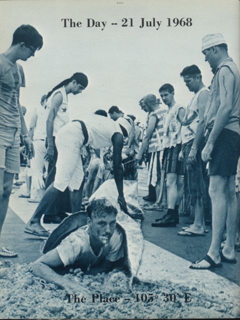 59k | Crossing the Equator, 21 July 1968, en route from Yankee Station to Singapore. Page from the USS Bennington (CVS-20) 1968 Cruise Book. Joe is the guy with the black bandana on his head, star on his vest. |