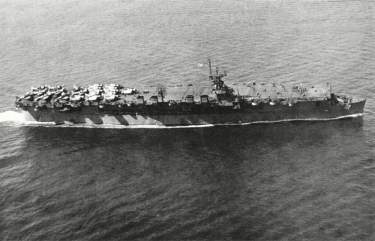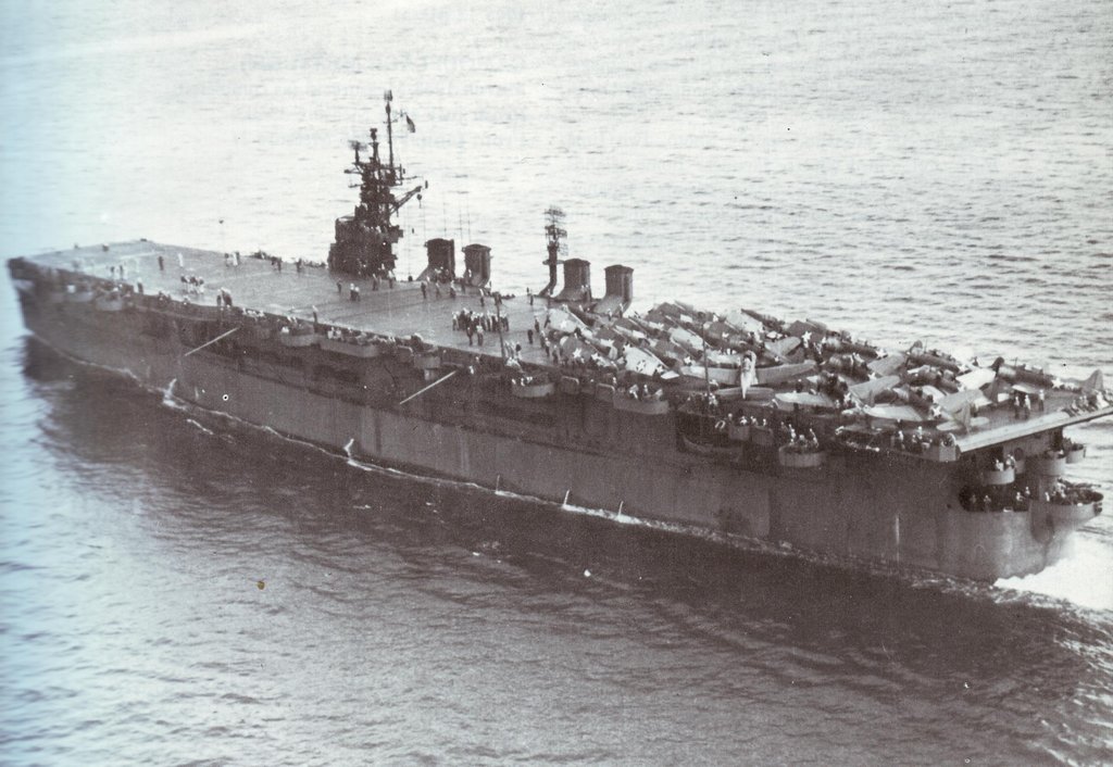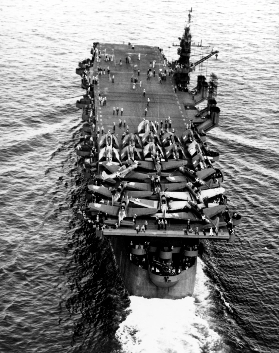 89k | Underway in the Atlantic area, during her shakedown cruise, 31 May 1943. Planes parked aft include nine SBD scout bombers and twelve F4F fighters. Official U.S. Navy Photograph, now in the collections of the National Archives (photo # 80-G-65971). |