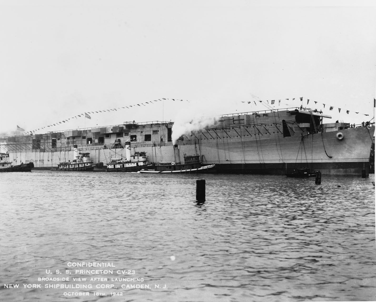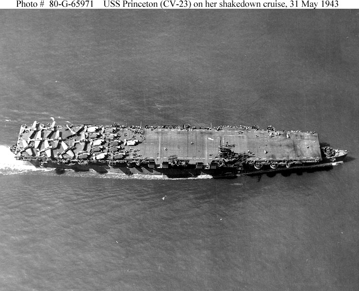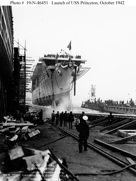143k | Ordered on 1 July 1940 as a Cleveland-class light cruiser, this ship was assigned hull number CL-61 and named Tallahassee, for the capital of Florida (NS022349). Designated for completion as an aircraft carrier, was reclassified CV-23 on 16 February 1942; reordered from New York S.B., 18 March 1942. Renamed Princeton, 31 March 1942, after a borough in west central New Jersey (NS022349a), scene of a famous Revolutionary War battle (2–3 January 1777, NS022349b) and birthplace of Captain Robert F. Stockton, who commanded the first Princeton. Previous ships that had borne the name: