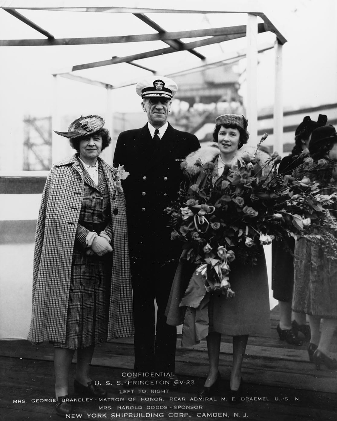 197k | Mrs. Lillian Fay Brakeley, wife of Princeton University Vice President and Treasurer George Brakeley, and Matron of Honor; Rear Admiral Mylo F. Draemel, Commandant of the 4th Naval District; and Mrs. Margaret Dodds, wife of University of Princeton President Harold Dodds, sponsor, after the successful launch of the light carrier Princeton (CV-23), 18 October 1942. (Special thanks to Sean Hert, who was able to find out Lillian Brakeley's first name via her husband's draft card.) Photograph from the collections of the National Archives and Records Administration (NARA), College Park, MD, # 19-N-46448. |