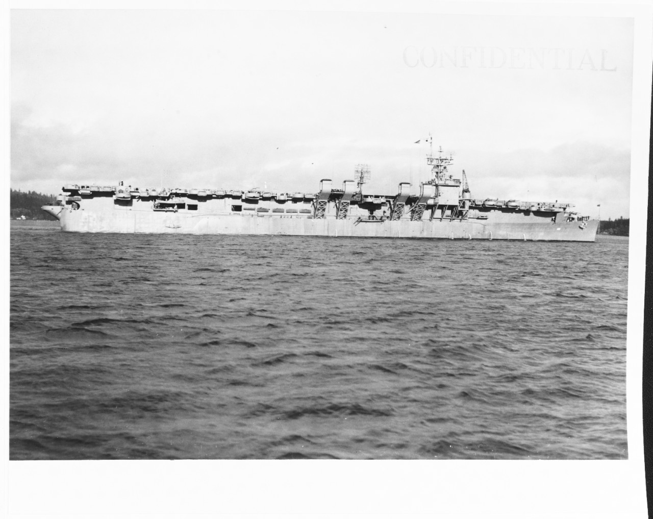 186k | Two days before launch, showing the aft 5"/38 gun tub the class was originally designed with. When the quad 40MM was in place, this tub always had the underside of the platform enclosed and the guns did not survive long enough to make it on to Princeton's shakedown cruise. Photograph from the collections of the National Archives and Records Administration (NARA), College Park, MD, # 19-N-46450. |
