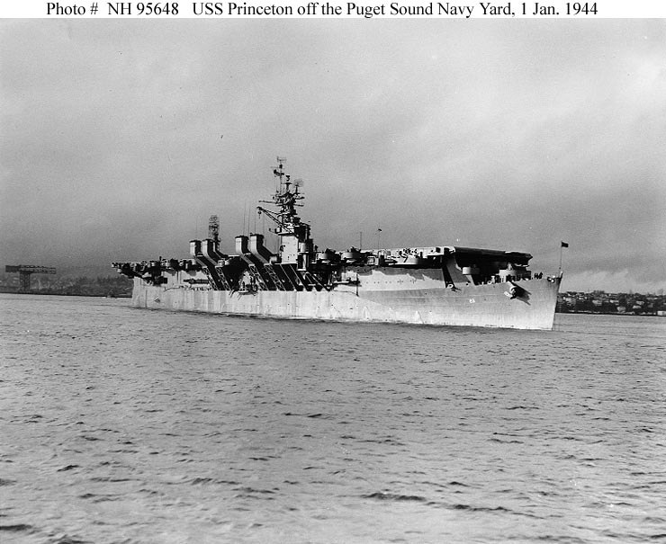 204k | USS Princeton (CVL-23) off the Puget Sound Navy Yard, Bremerton, Washington, 1 January 1944. Official U.S. Navy Photograph, from the collections of the Naval History & Heritage Command (NH&HC), # NH 95647. |
