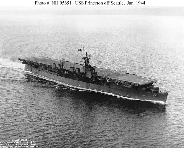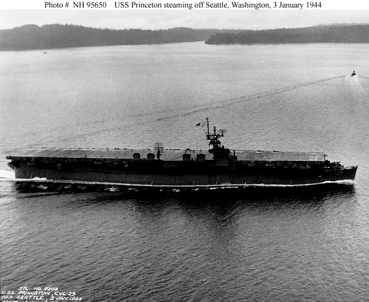 96k | USS Princeton (CVL-23) steaming off Seattle, Washington, 3 January 1944. Official U.S. Navy Photograph, from the collections of the Historical Center (# NH 95650). |
