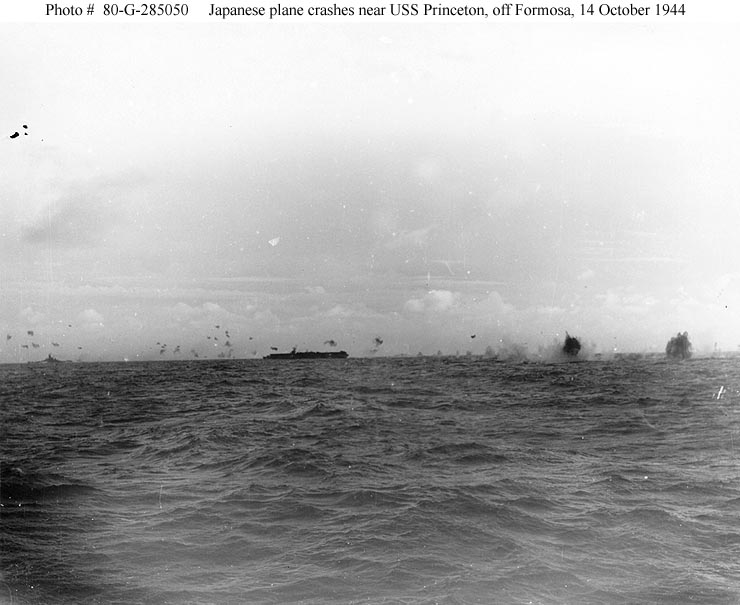 66k | Carrier raids on Formosa, October 1944 A Japanese airplane crashes near USS Princeton (CVL-23), during an air raid off Formosa, 14 October 1944. Battleship in the left distance is probably USS South Dakota (BB-57) or USS Alabama (BB-60). Official U.S. Navy Photograph, now in the collections of the National Archives (# 80-G-285050). |