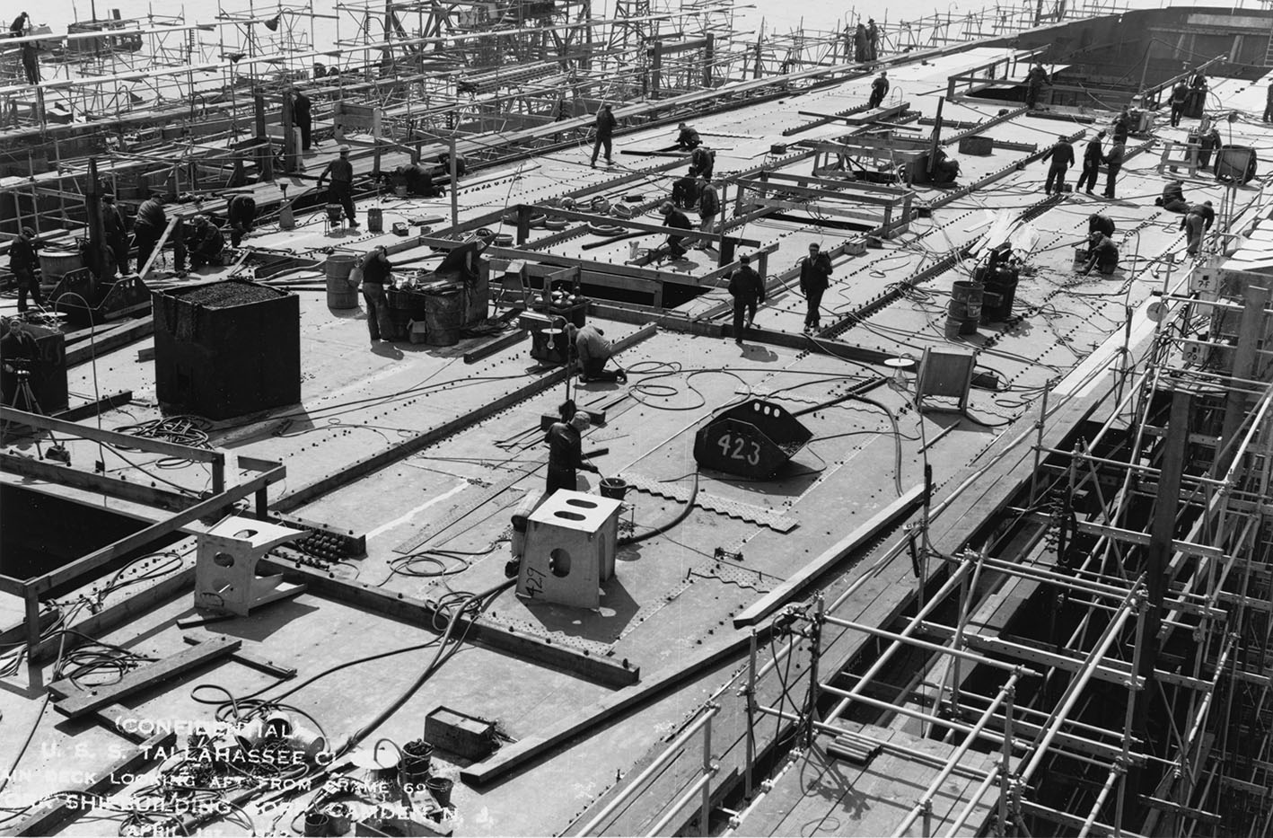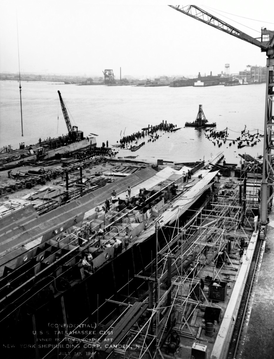 287k | Tallahassee (CL-61) under construction at the New York Shipbuilding Corp., Camden, New Jersey, on 1 July 1941. View shows the inner bottom, looking aft. National Archives and Records Administration (NARA), photo # 19-N-44097. |