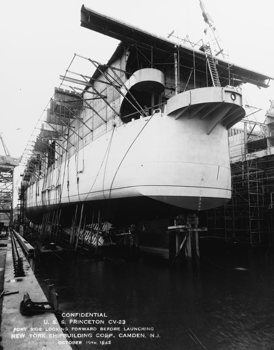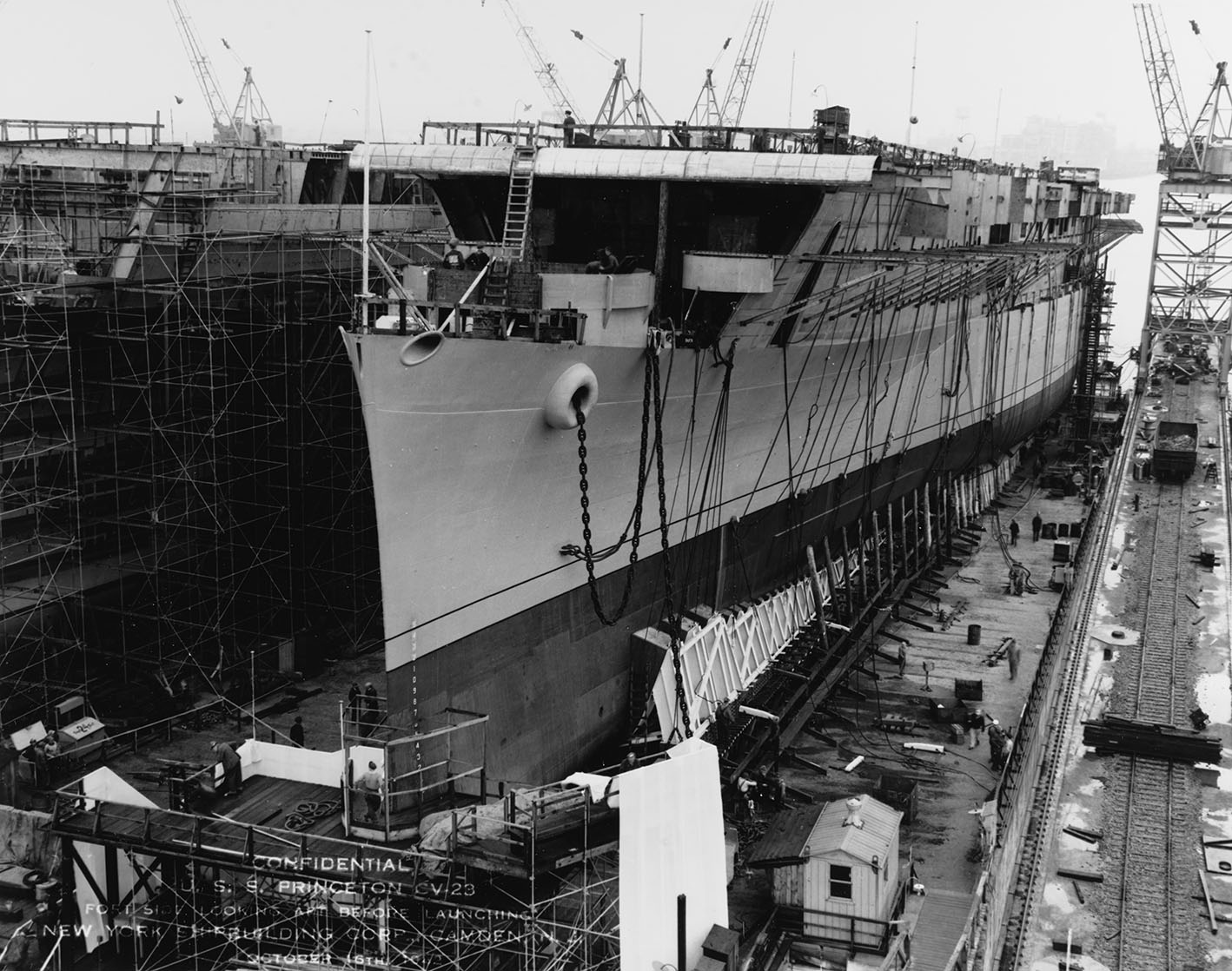 285k | Princeton (CV-23), two days before launch. Forward gun tub is for a 5"/38 gun that was originally planned for the class and was replaced with a smaller tub with a quad 40MM mount before her shakedown cruise. The band stand that will be used as part of the launching ceremony has been built up around the bow. Photograph from the collections of the National Archives and Records Administration (NARA), College Park, MD, # 19-N-46449. |