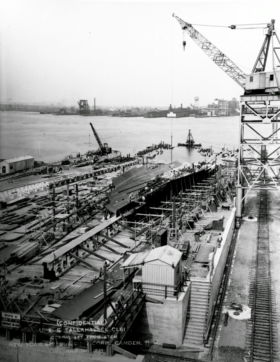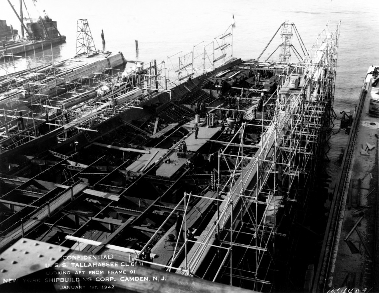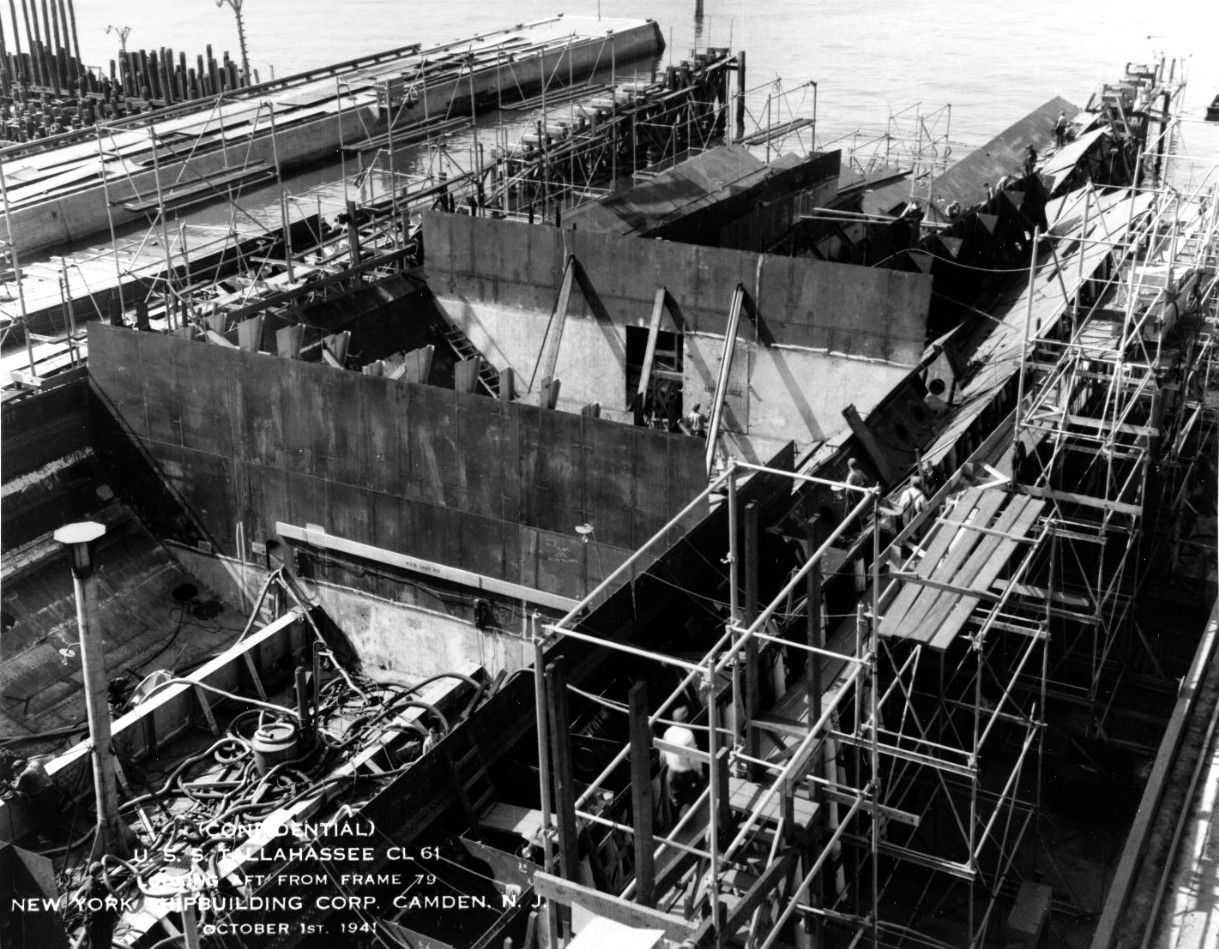 344k | Tallahassee (CL-61) under construction at the New York Shipbuilding Corp., Camden, New Jersey, on 1 October 1941. View shows bottom plating and lower hull structure, looking aft from frame 79. National Archives and Records Administration (NARA), photo # 19-N-44096. |