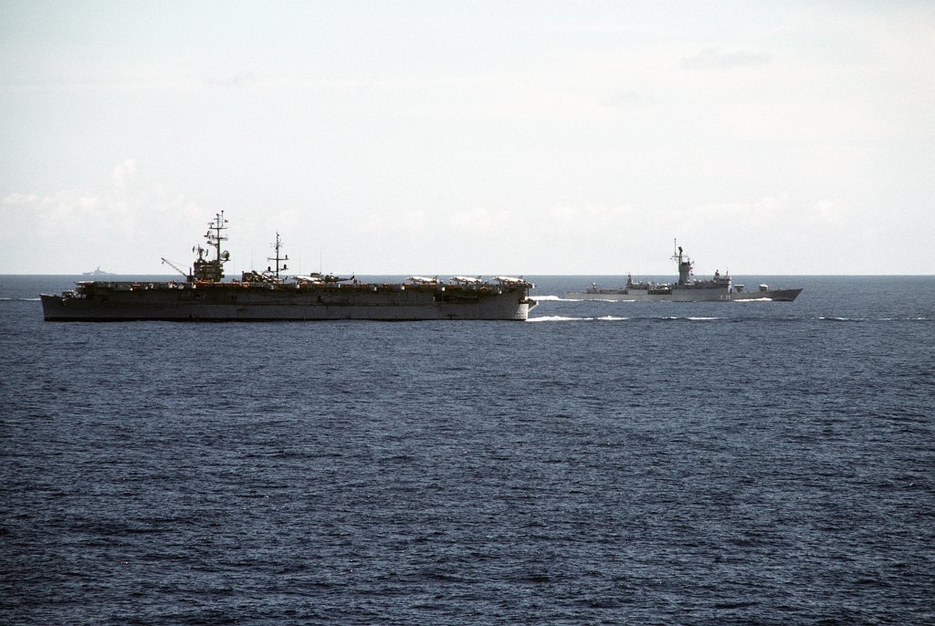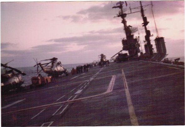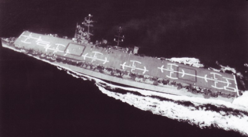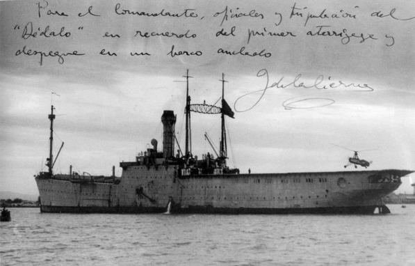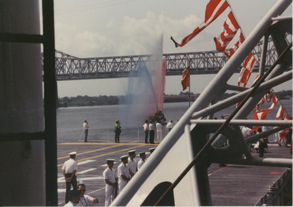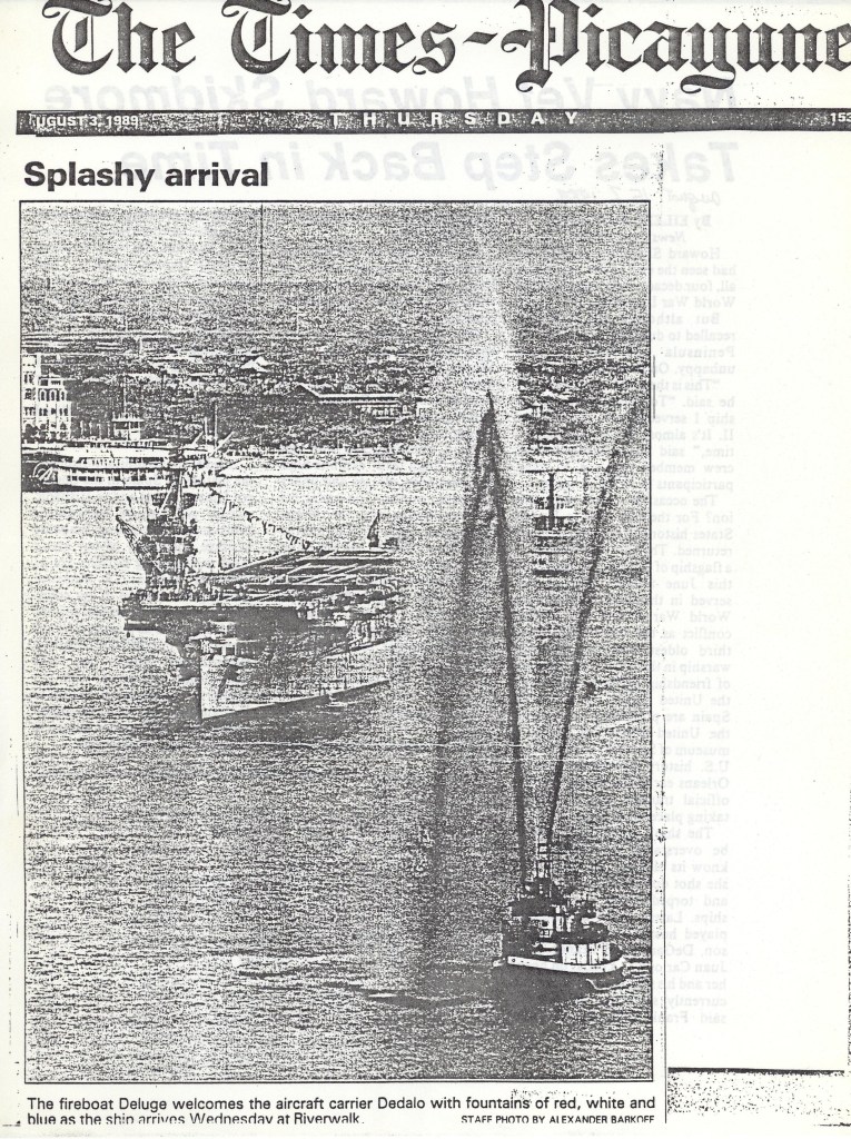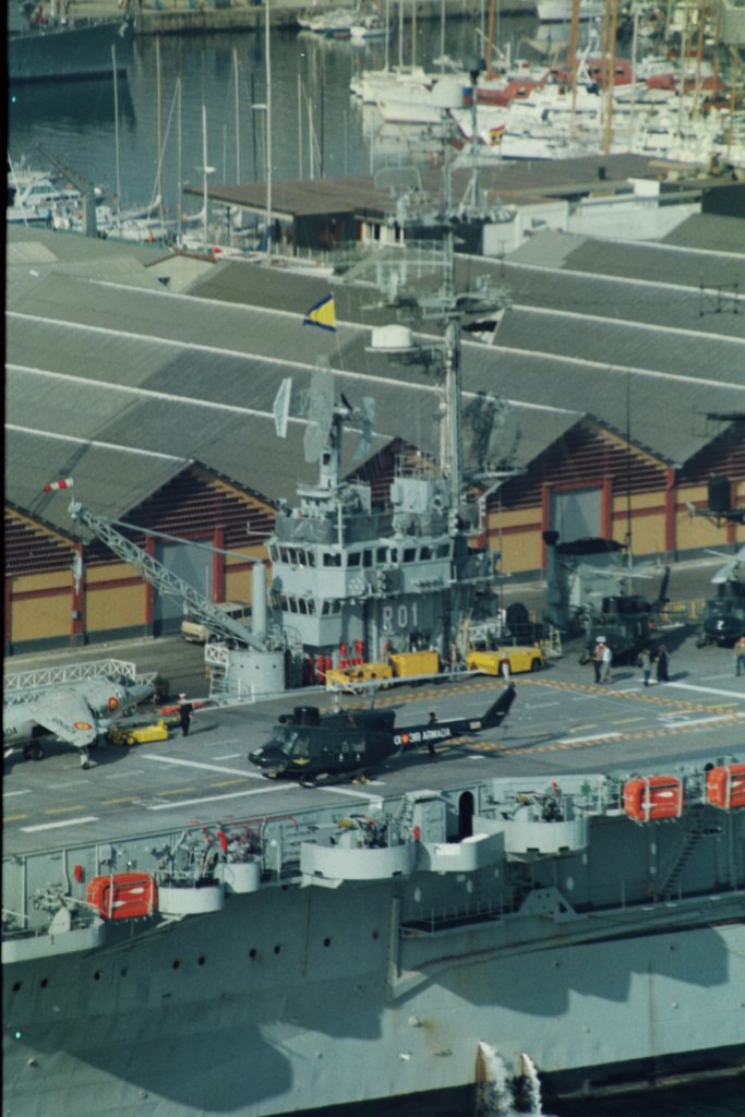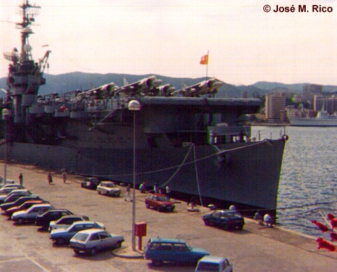 385k | Mississippi River, New Orleans, 12 November 1989. Starboard broadside view of Cabot/Dédalo. Spanish flag. US flag. Photos by Mr. Howard H. Skidmore, CAPT, USN (Ret.) |