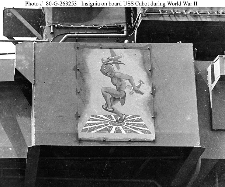 106k | Closeup view of the ship's port side bridge wing, showing her insignia, circa 1943-44. The design is based on the slogan of Cabot's first Commanding Officer, Captain Malcolm F. Schoeffel: "Up Mohawks, At 'Em!". "Mohawk" was the ship's voice radio call sign at the time. (See also NS022848). Official U.S. Navy Photograph, now in the collections of the National Archives (photo # 80-G-263253). |