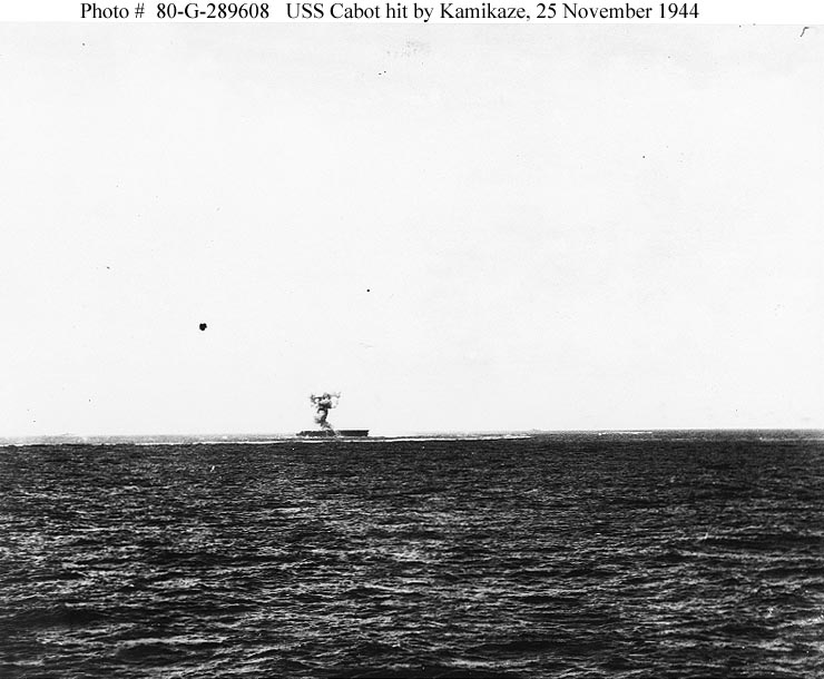 76k | USS Cabot (CVL-28) is hit by a Kamikaze, while operating with Task Force 38 off Luzon, 25 November 1944. Official U.S. Navy Photograph, now in the collections of the National Archives (photo # 80-G-289608). |