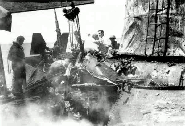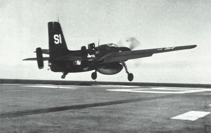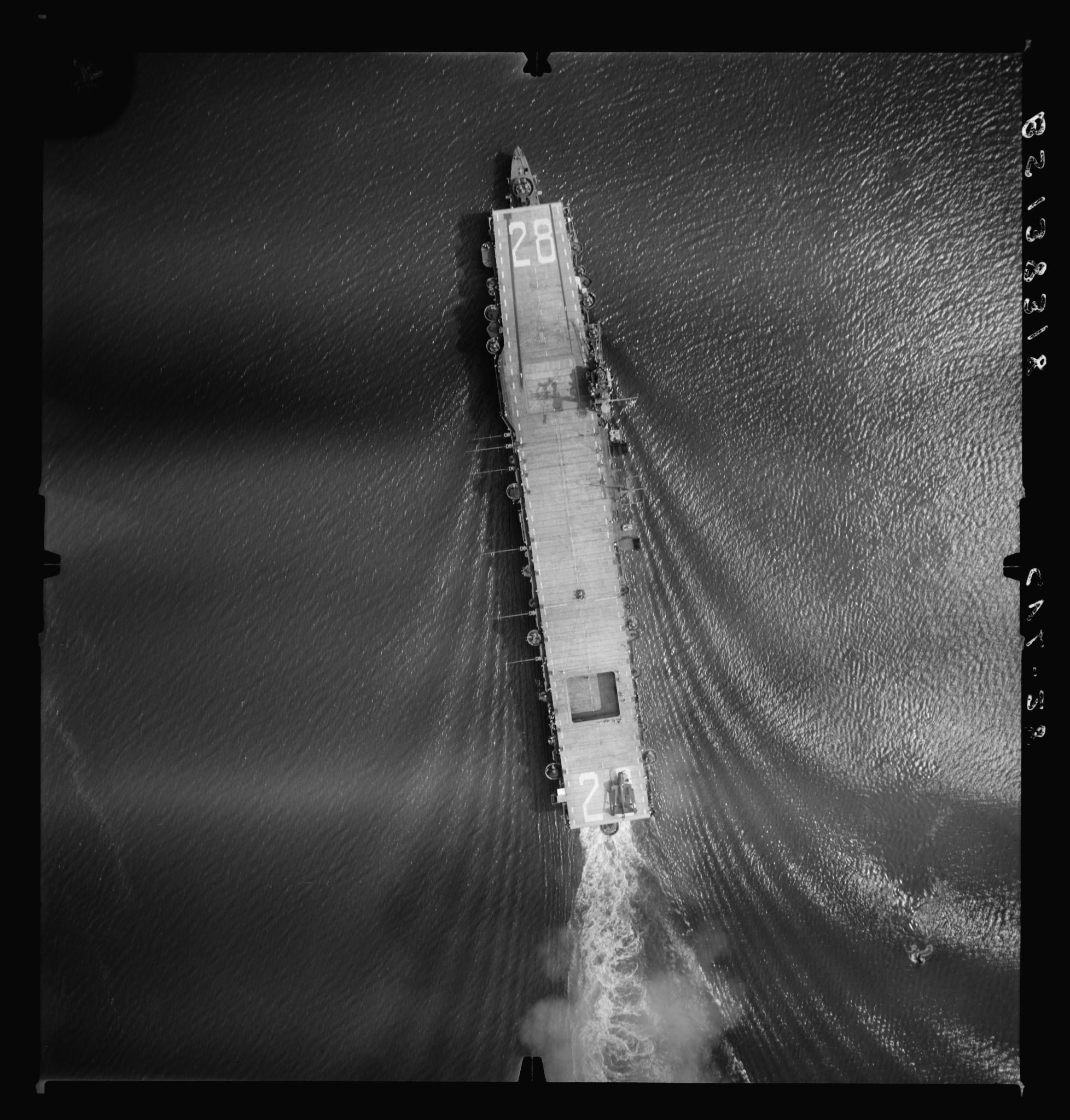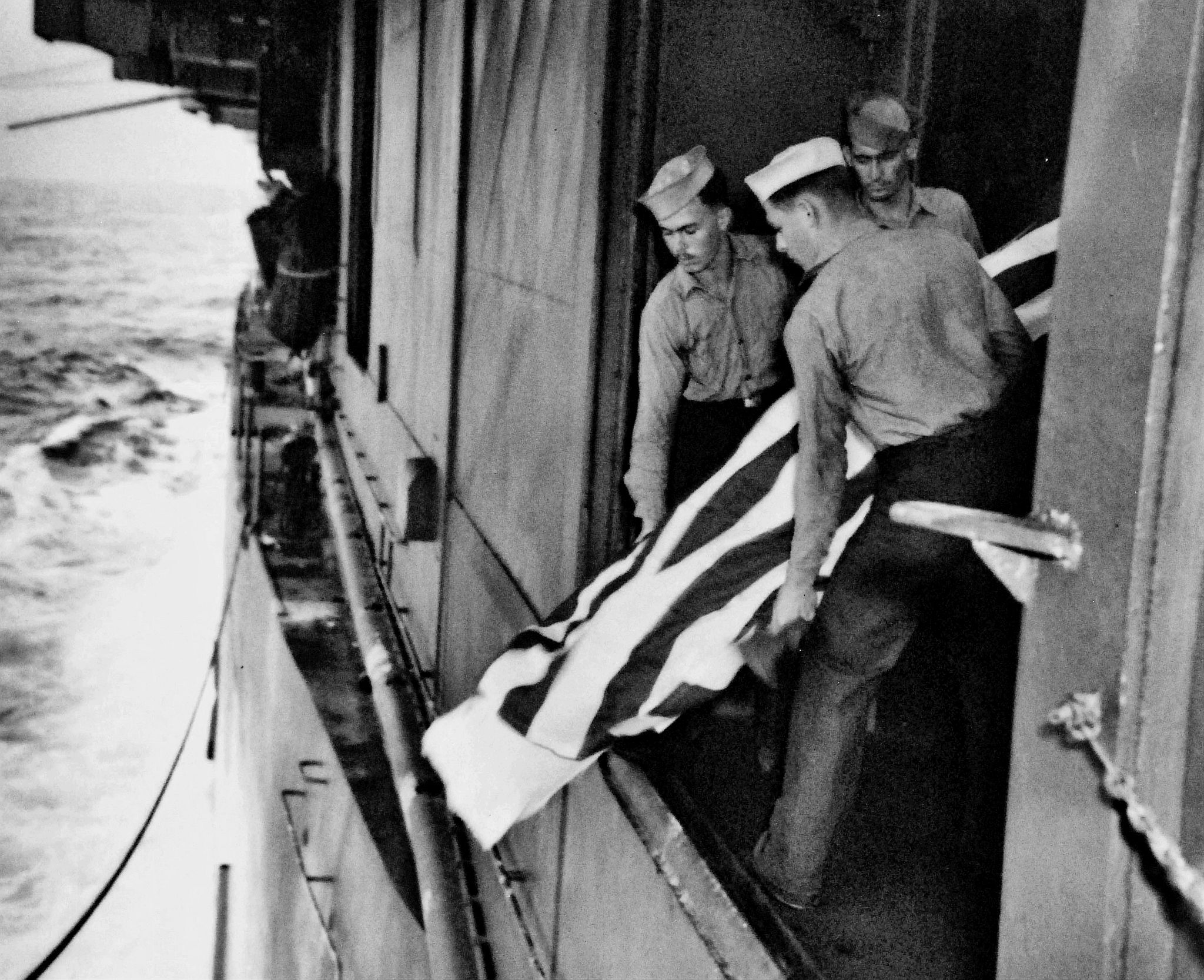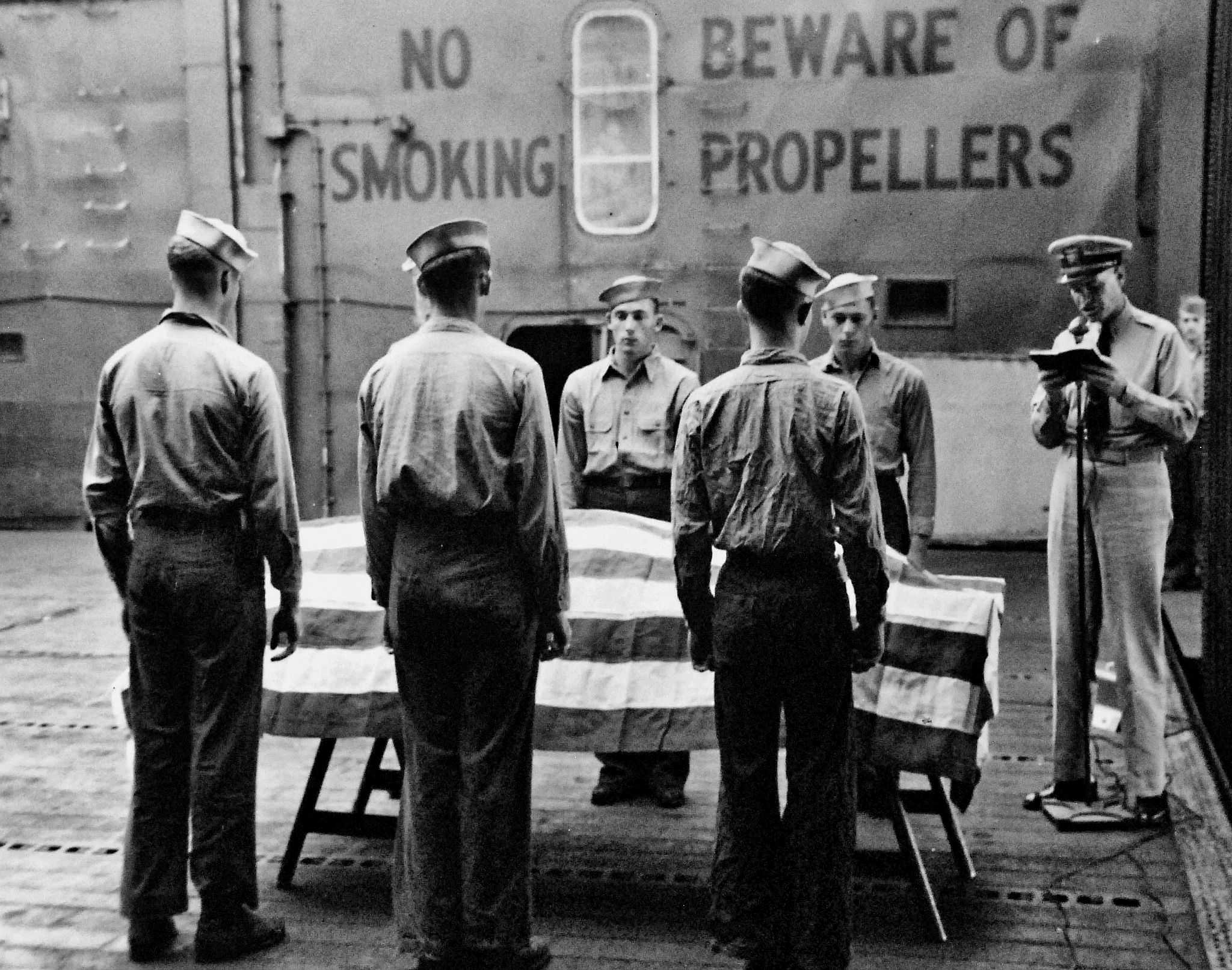 673k | Burial at sea, 30 April 1944. AMM2/c Wallace James Schuetz, Torpedo Squadron (VT) 8, Carrier Air Group (CAG) 8, USS Bunker Hill (CV-17) was killed in action the previous day, while attacking Truk, when his aircraft (TBF-1C Avenger BuNo 47922, #27), was hit by Japanese AAA. Since the flight deck of his own carrier was fouled, and believing his gunner was seriously wounded but still alive, pilot, ENS (LT(JG)?) L.G. Mason, recovered aboard USS Cabot (CVL-28). Sadly, 22-year-old Schuetz was already dead. He was buried at sea with full military honors at 1116, 30 April. |