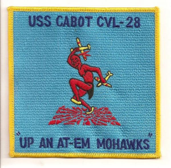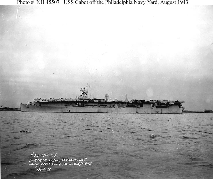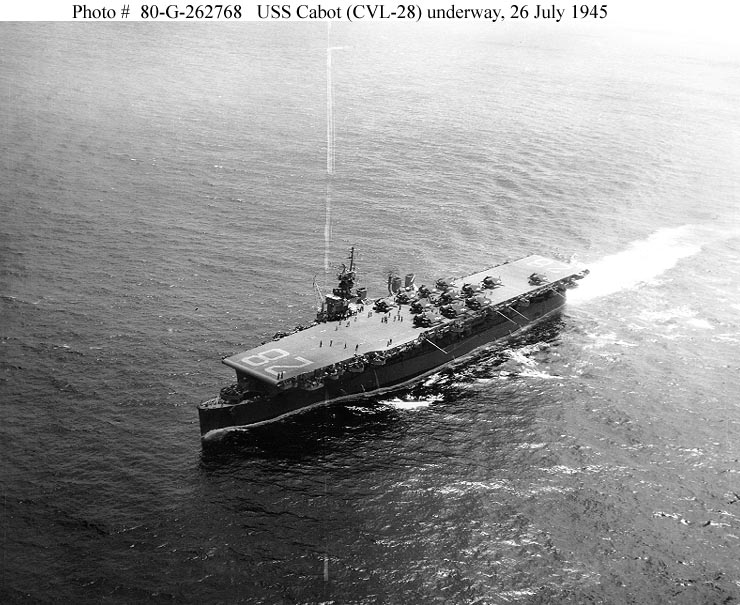Ordered as the Cleveland-class light cruiser Wilmington (CL-79). Contract awarded to New York Shipbuilding Corp., Camden, N.J. Laid down 16 Mar 1942. Reordered as carrier and redesignated CV-28, 2 Jun 1942; renamed Cabot 23 Jun 1942. Launched 4 Apr 1943. Redesignated as "Light Aircraft Carrier" (CVL-28) 15 Jul 1943. Commissioned 24 Jul 1943. She was awarded a Presidential Unit Citation and nine "Battle Stars" for service during WW II; damaged by kamikaze 25 Nov 1944. Decommissioned to reserve 11 Feb 1947.