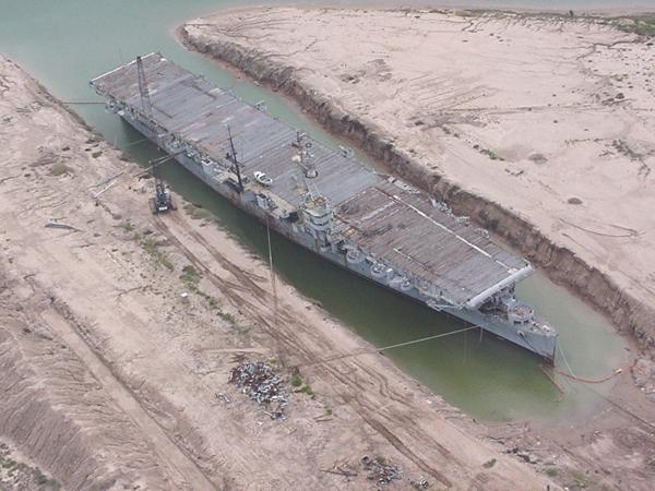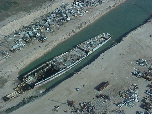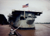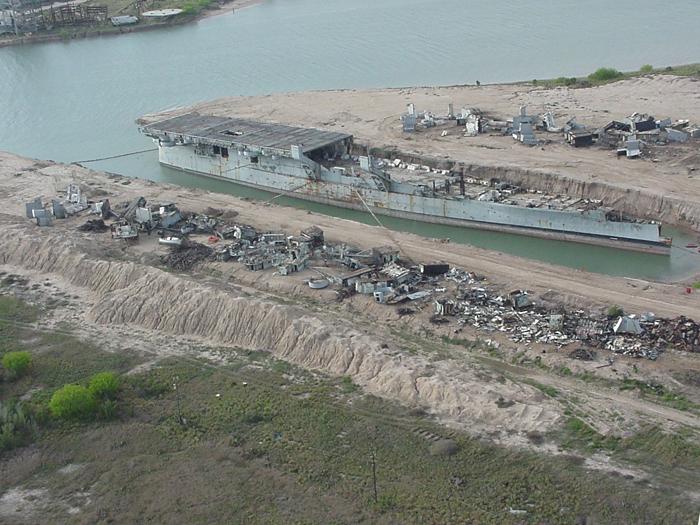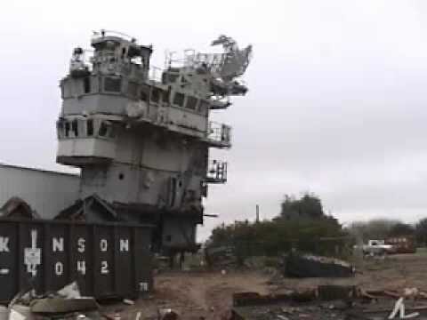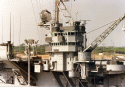 71k | Brownsville21 March 2001. In a last minute effort to preserve something of the ship, the Texas Air Museum (Rio Hondo, Tx) acquired the island, CIC, and pilot briefing room for a museum exhibit which would have served as the USS Cabot Memorial. NS022820a: The island, however, was finally demolished. (See video here.) |