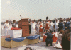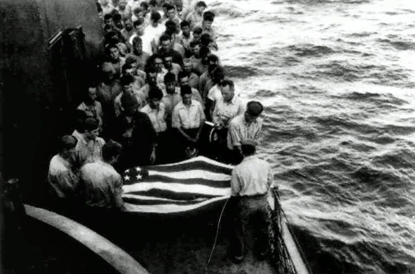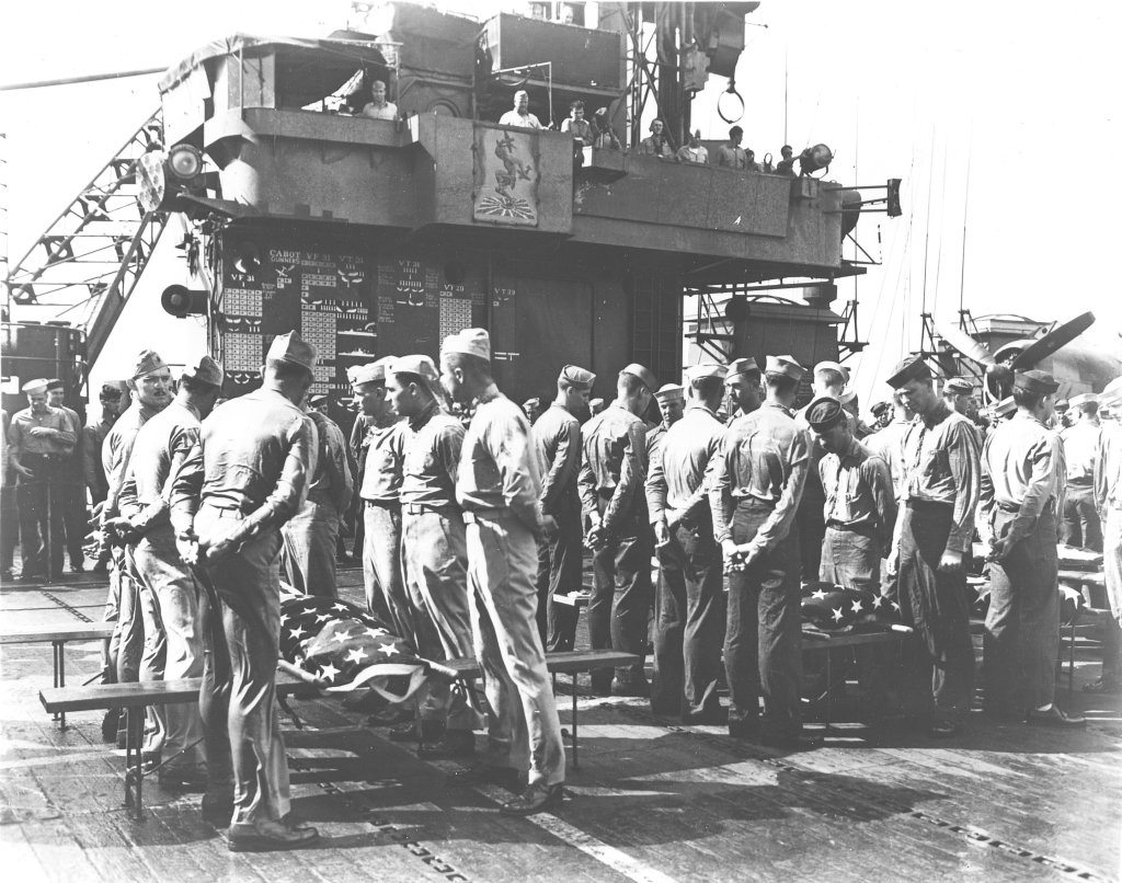 184k | Memorial service aboard USS Cabot (CVL-28). USN photo via Floating Drydock. In all probability this picture shows the burial at sea, November 26, 1944 of five of the victims of the kamikaze attack the day before. Donald F. Hayde comments: "The group on the left are Marines and the body no doubt is of Sergeant Major Lewis J. Camp, since he was the only Marine KIA [that day]." (For a list of casualties, see "The Kamikaze Attack and Related Stories," Chapter 7 of J. Ed Hudson's A History of the USS Cabot (CVL-28): A Fast Carrier in World War II.) |