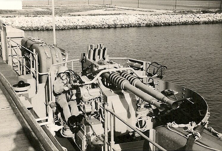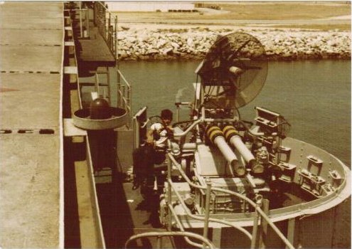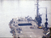 322k | Mississippi River, New Orleans, 11 November 1989. Note US flag flying astern and US name (Cabot) on the starboard quarter. Spanish flag was flying on the bow and Spanish name (Dédalo) appeared on the port quarter. Photo by Mr. Howard H. Skidmore, CAPT, USN (Ret.) |