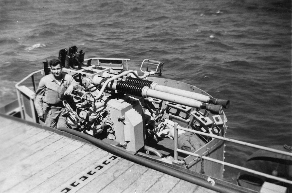 80k | Marine Detachment aboard USS Cabot (CVL-28) exercising 20-mm gun, port side amidships. Date and location unknown. |
