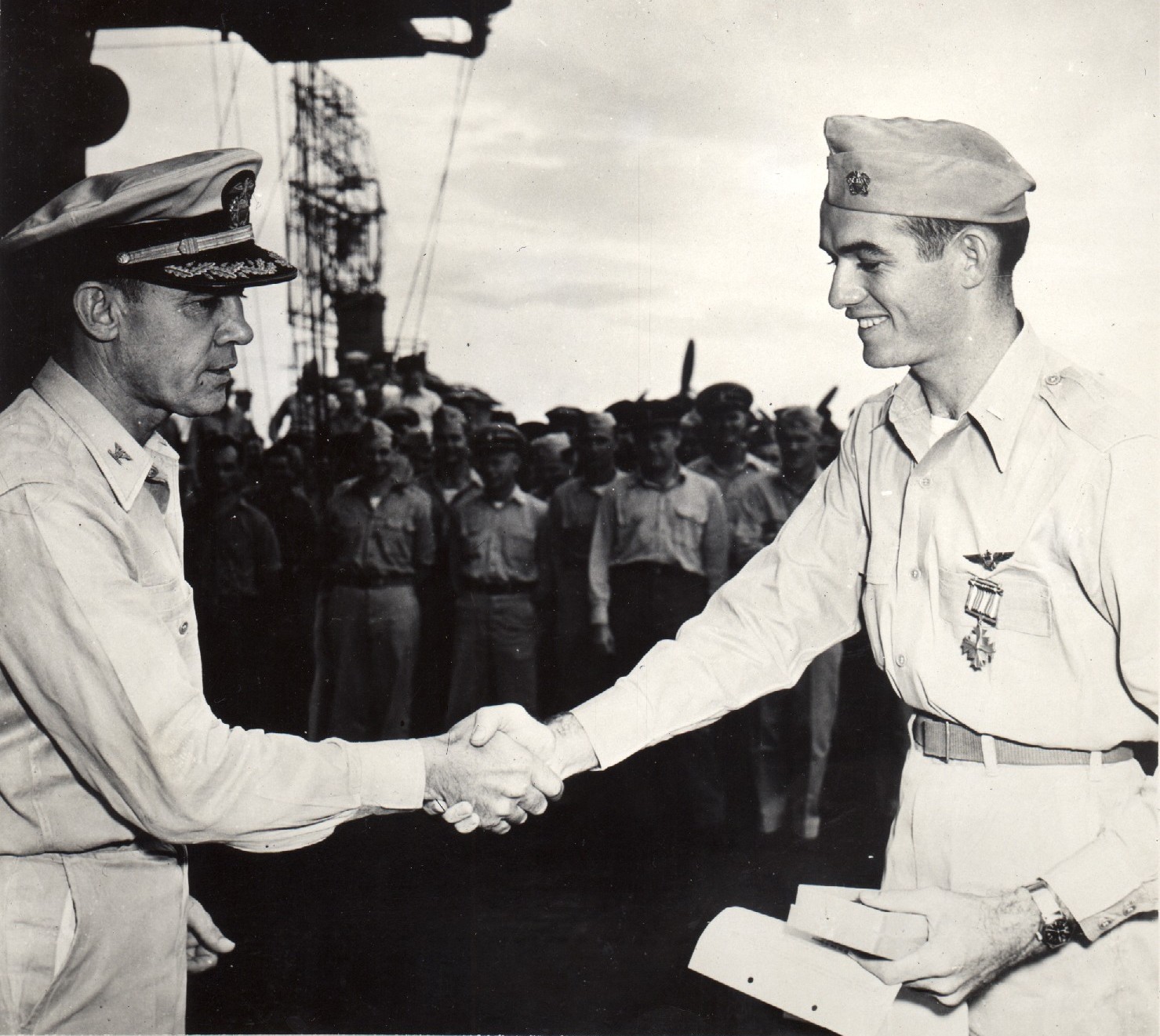 480k | LT Adolph J. "Al" Mencin was the Executive Officer (XO) of VF-31. During his tenure aboard USS Cabot (CVL-28) he was awarded the Silver Star twice, the Distinguished Flying Cross, and the Air Medal with three Gold Stars. He was an air combat Ace with six victories over Japanese aircraft. The "Flying Meataxers" destroyed 165.6 Japanese airplanes in aerial combat, top among all CVL (light carrier) squadrons. They deployed with Cabot from November 1943 through September 1944. The squadron was established on 1 May 1943, under command of LCDR Robert A. Winston, and left San Diego NAS in November 1943, to take part in the havoc that the Fast Carrier Task Force wreaked upon the Japanese Navy in 1944. |
