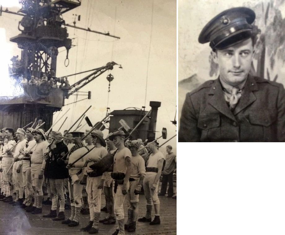 92k | US Marine Detachment aboard USS Cabot (CVL-28), crossing the Equator, January 1944. Platoon Sergeant Francis J. Hayde, USMC, 1943–1945, is in the photo, in the dark blue tunic, wiping something from his eye. |