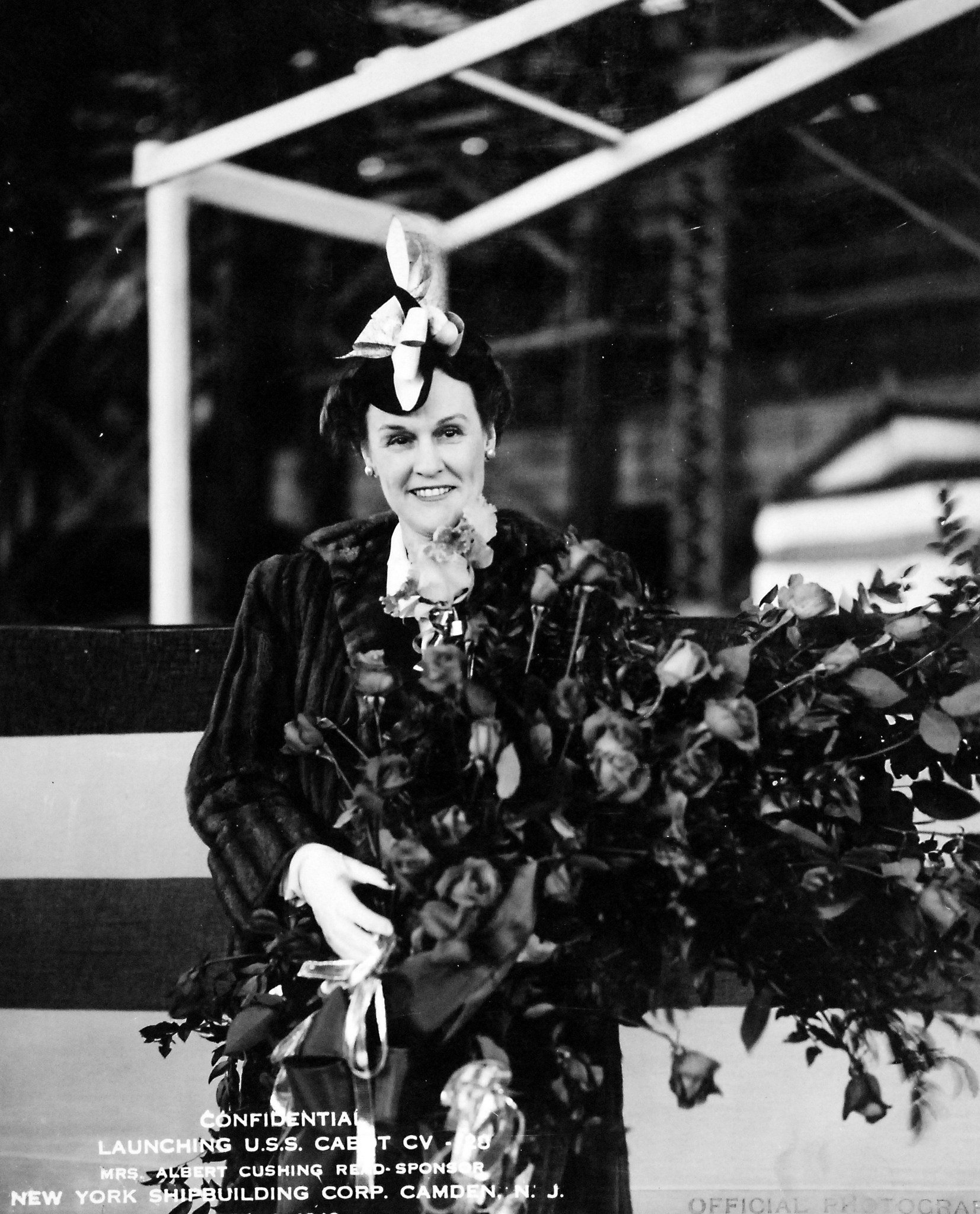 600k | Mrs. Albert C. Read (Elizabeth "Bess" Burdine Read), ship's sponsor of USS Cabot (CV-28), before launching at New York Shipbuilding Corporation, Camden, New Jersey. Photograph released 4 April 1943. National Archives and Records Administration (NARA) photo, # 80-G-41536. |