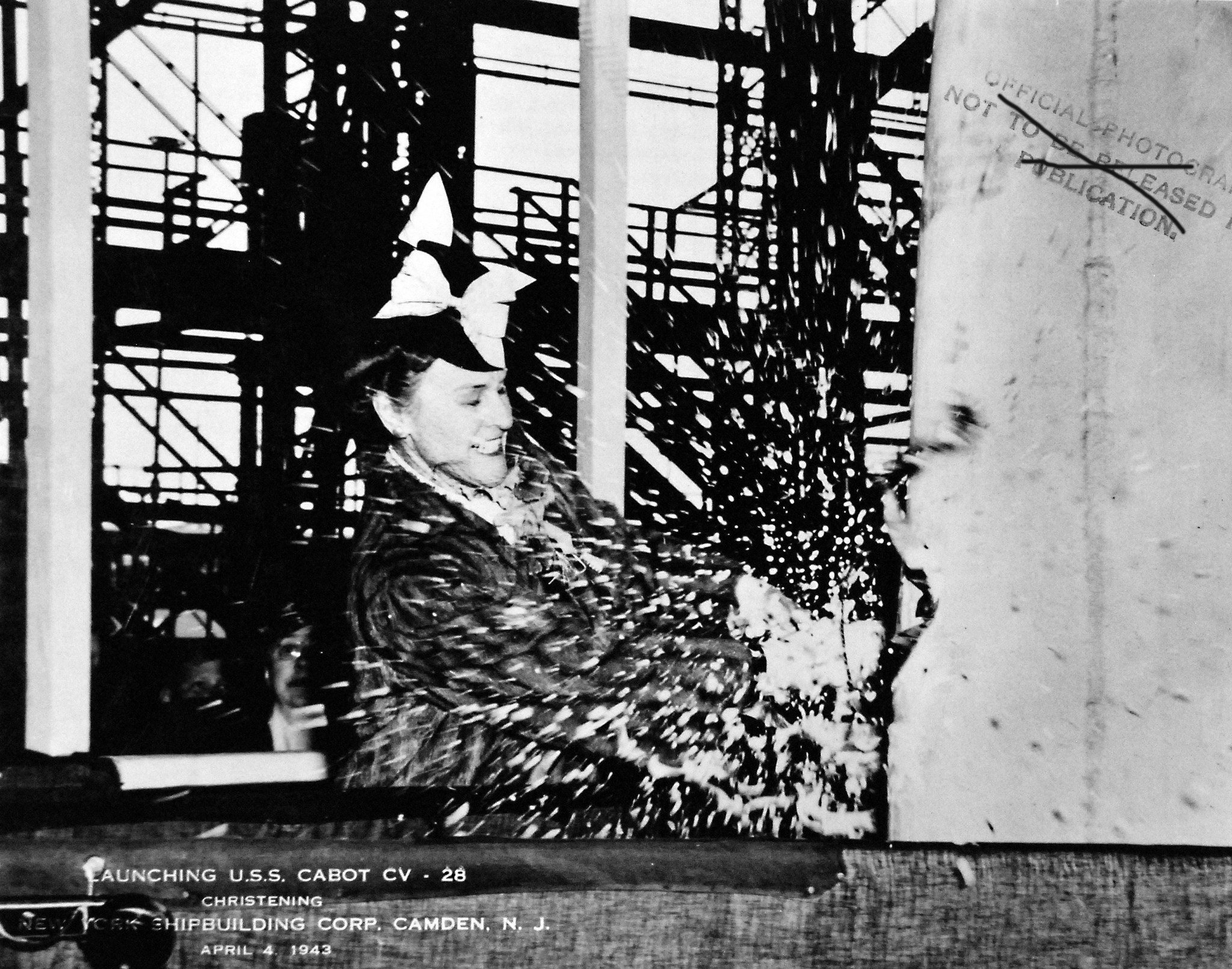 757k | Mrs. Albert C. Read (Elizabeth "Bess" Burdine Read), ship's sponsor of USS Cabot (CV-28), christening the ship at New York Shipbuilding Corporation, Camden, New Jersey. Photograph released 4 April 1943. National Archives and Records Administration (NARA) photo, # 80-G-41539. |